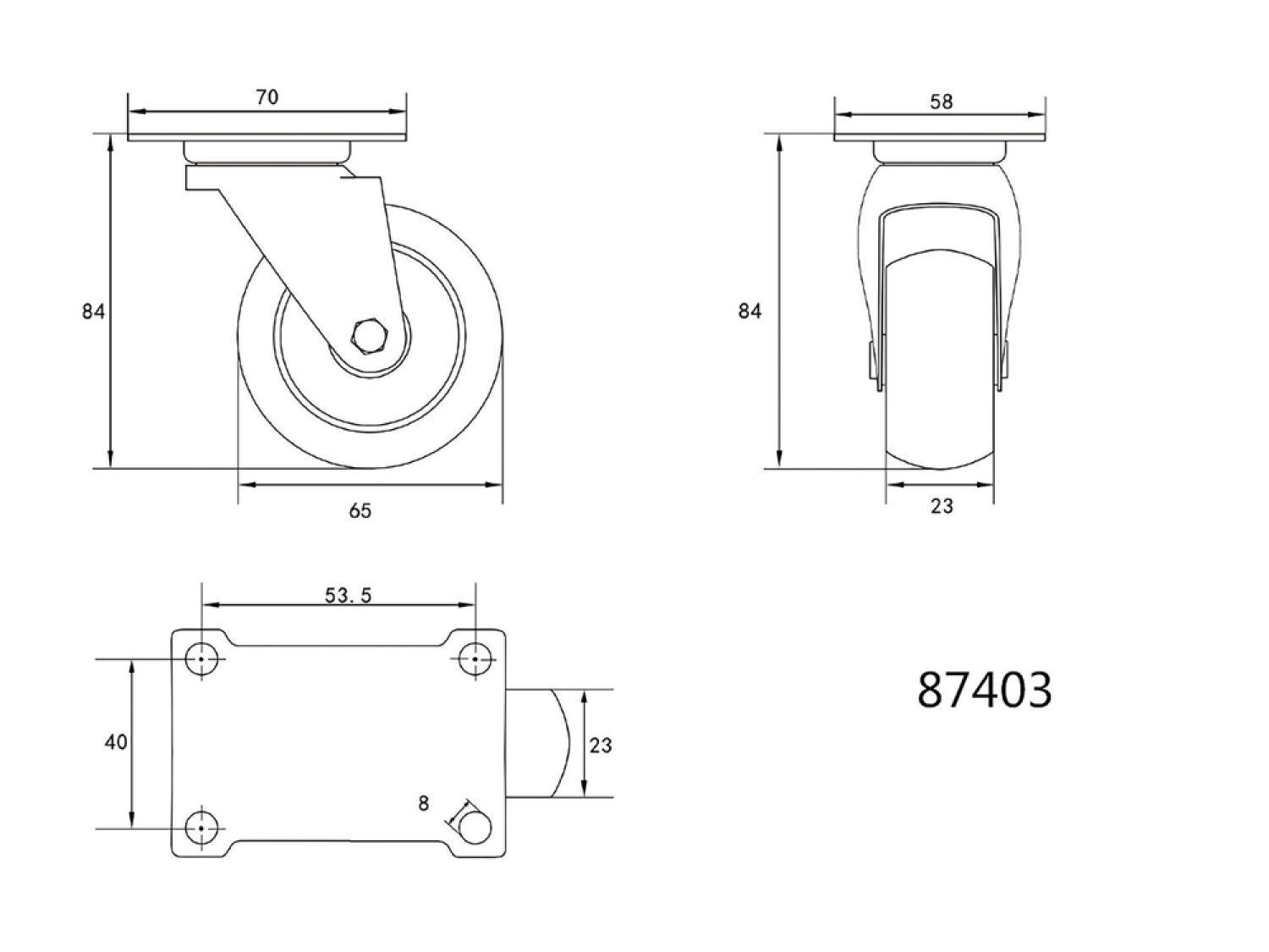 This swivel caster features a fixed wheel diameter of 65 mm and is constructed from polypropylene, providing both strength and a sleek appearance.