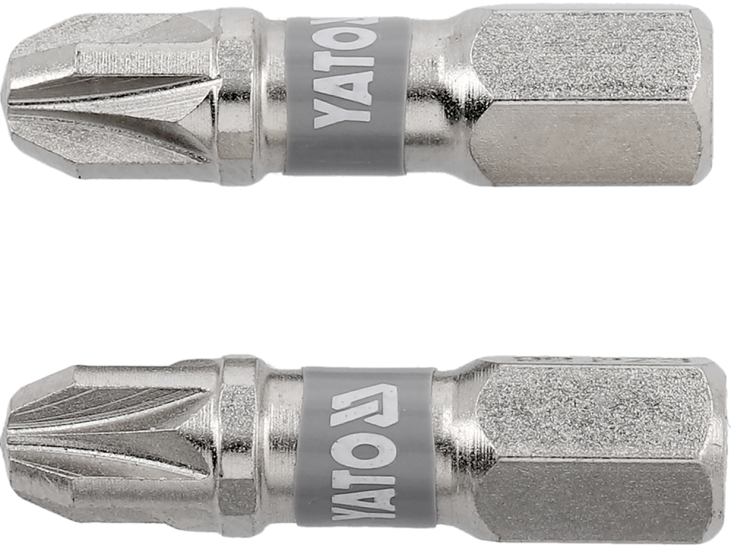 The YATO YT-78005 screwdriver bits are essential accessories for various drilling and fastening tasks. This set includes two 1/4" (6.3 mm) Pozidriv bits, each measuring 25 mm in length, made from S2 steel and nickel-plated for enhanced durability.