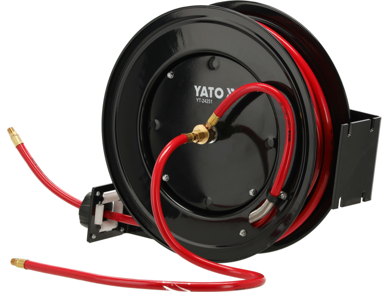 The YATO Metal Air Hose Reel (Model Code: YT-24251) is designed for pneumatic tools and provides a convenient solution for storing and using air hoses. With its robust build and auto-rewind feature, this reel is an excellent addition to any workshop or garage.