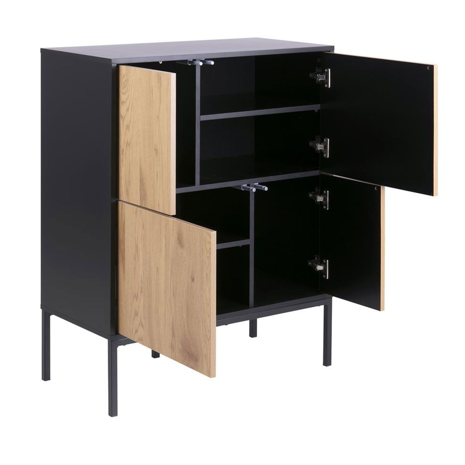 Sideboard SEAFORD 80x40xH103cm. This sideboard puts the sophisticated industrial design on full display with its wild oak effect and a contrasting black frame. Defined by clean lines and push to open function, this design has a contemporary yet hearty soul that warms up any room. Besides the look, you might also appreciate the spacious storage hidden behind the 4 doors. You will find 2 shelves there and each can hold up to 15kg. Frame MDF, painted, matt black, 4 doors: wild oak look, metal legs: powder coated black. CARE: Generally, painted surfaces are low maintenance. Any spills must be instantly removed with a cloth wrung in mild soapy water and make sure to wipe dry. Do not scuff the surface with hard objects.
