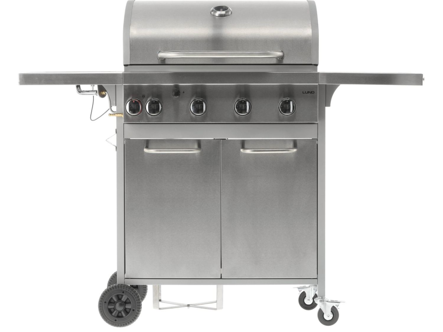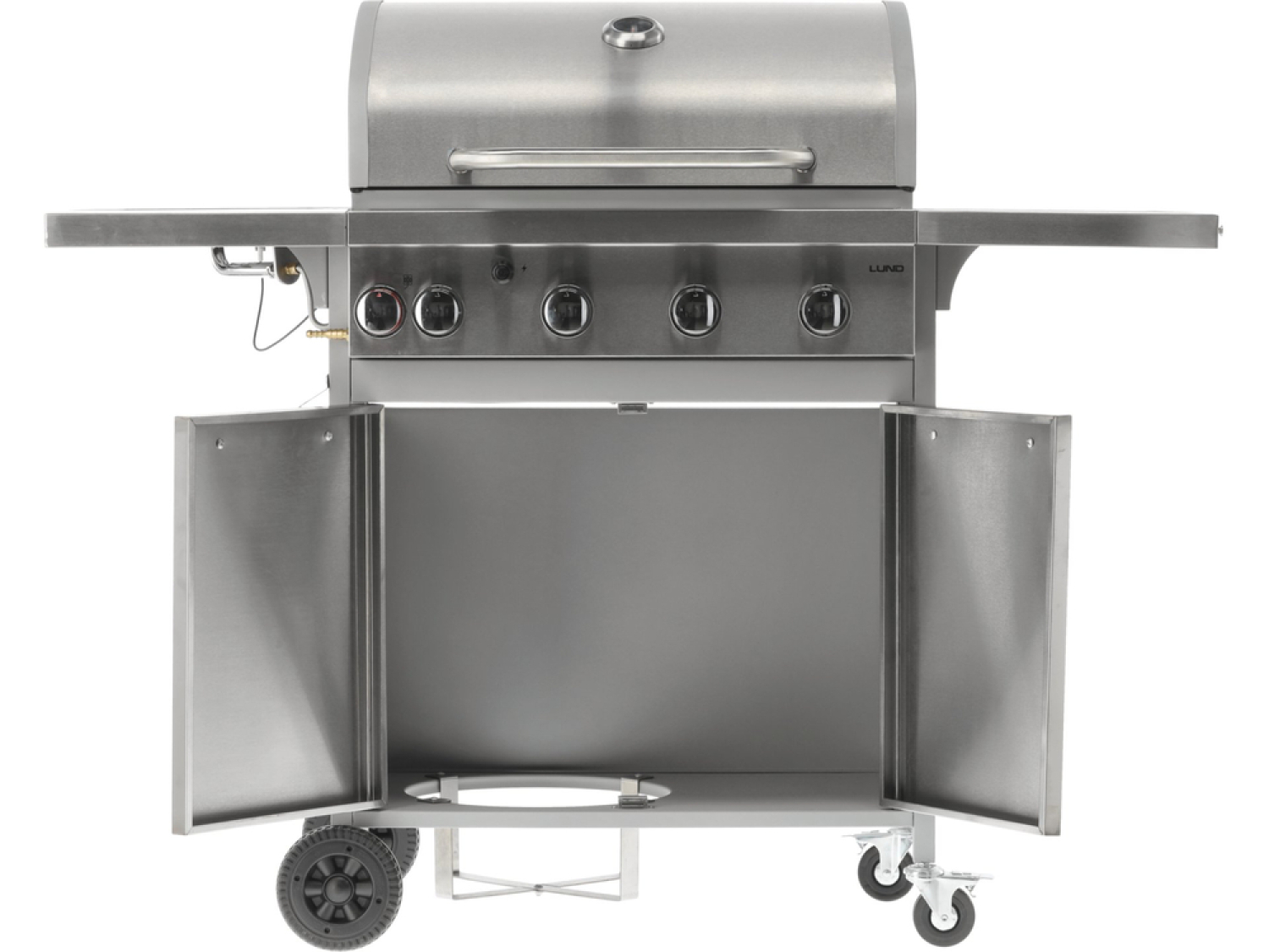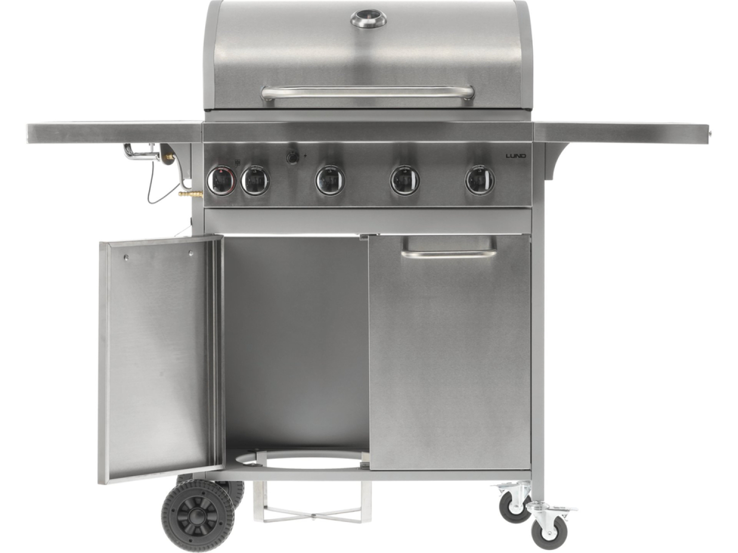 The LUND GAS GRILL AKKA 4+1 is a powerful and versatile grill made of stainless steel, featuring a durable cast iron grate. Its design includes side shelves and a spacious, lockable cabinet for convenient storage of necessary accessories. The grill is equipped with a 3.2 kW side burner, allowing you to cook and heat food in pots or pans. Additional features include a designated space for an 11 kg gas cylinder, a pull-out grease tray, and a built-in bottle opener.