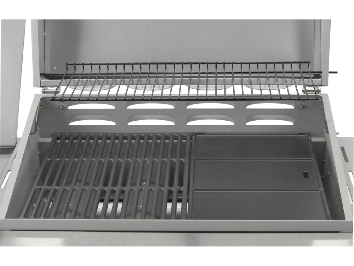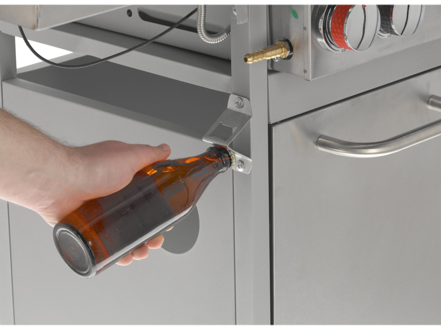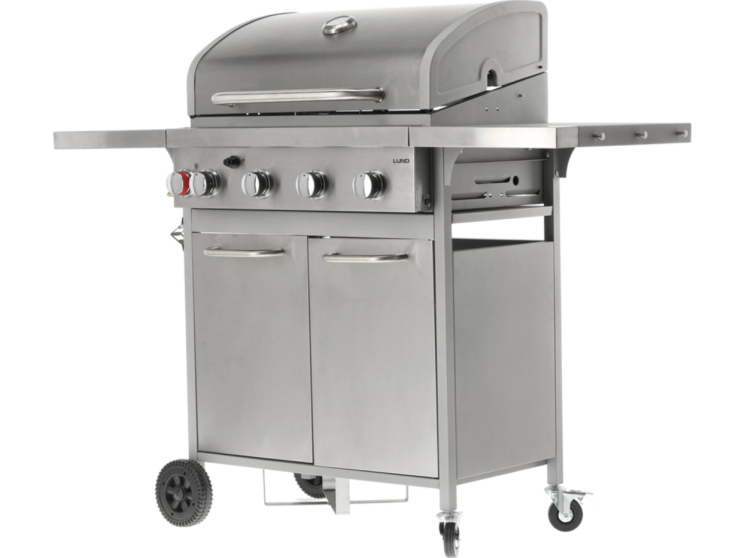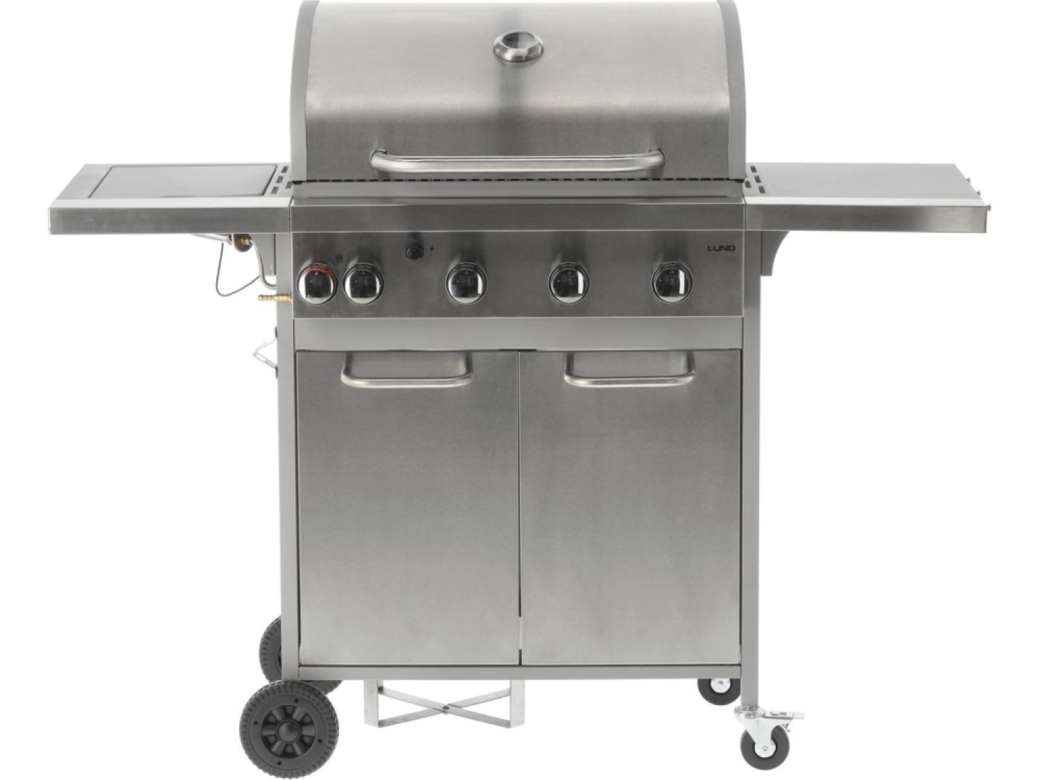The LUND GAS GRILL AKKA 4+1 is a powerful and versatile grill made of stainless steel, featuring a durable cast iron grate. Its design includes side shelves and a spacious, lockable cabinet for convenient storage of necessary accessories. The grill is equipped with a 3.2 kW side burner, allowing you to cook and heat food in pots or pans. Additional features include a designated space for an 11 kg gas cylinder, a pull-out grease tray, and a built-in bottle opener.