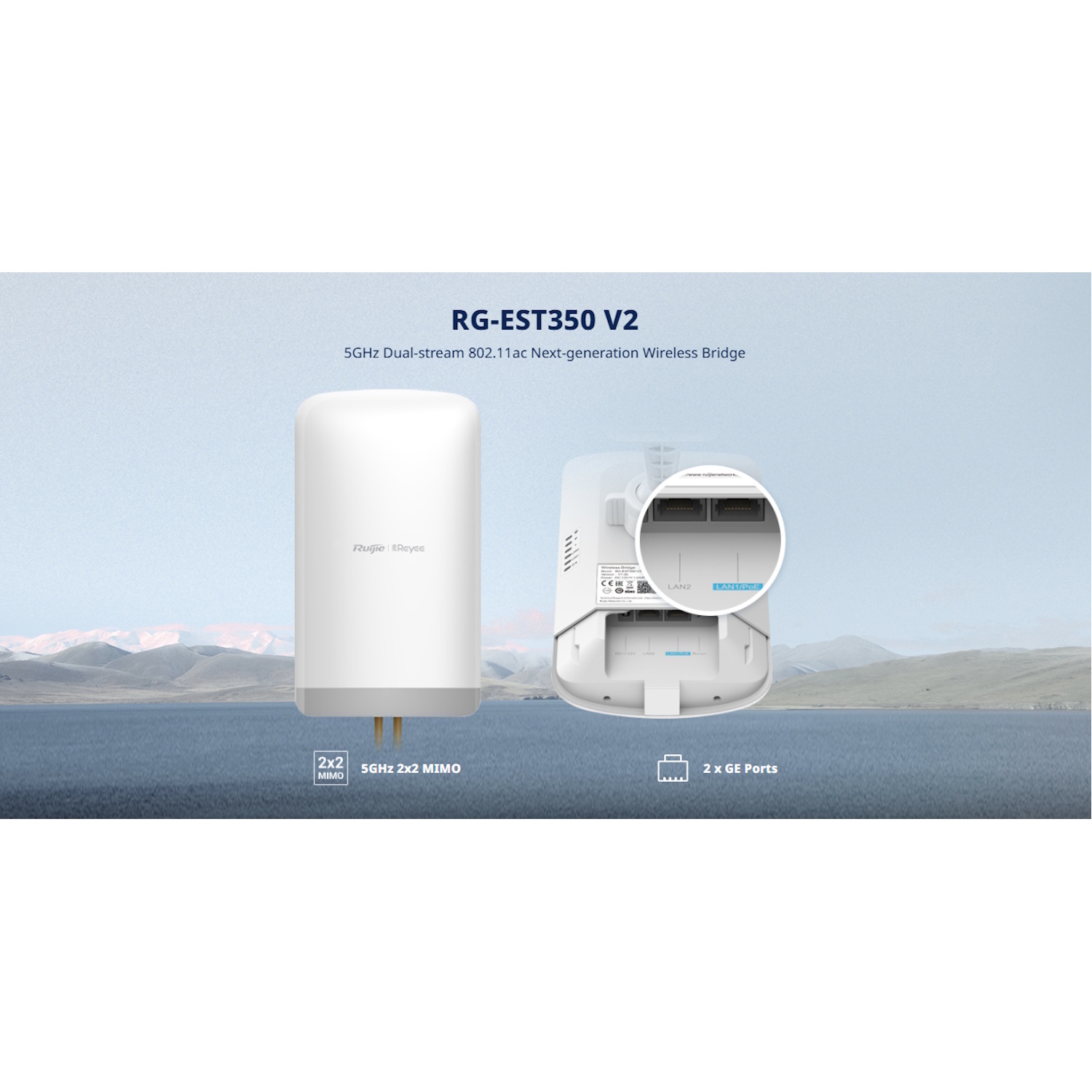 The Ruijie RG-EST350 V2 is a high-gain wireless bridge system designed for long-distance point-to-point deployments up to 5 kilometers. Operating on the 5GHz Wi-Fi 5 band (802.11ac) and equipped with dual-stream MIMO and 15 dBi directional antennas, this device ensures robust outdoor performance with fast, stable throughput — ideal for remote camera backhaul, warehouse-to-office links, farm networks, and smart city connectivity.