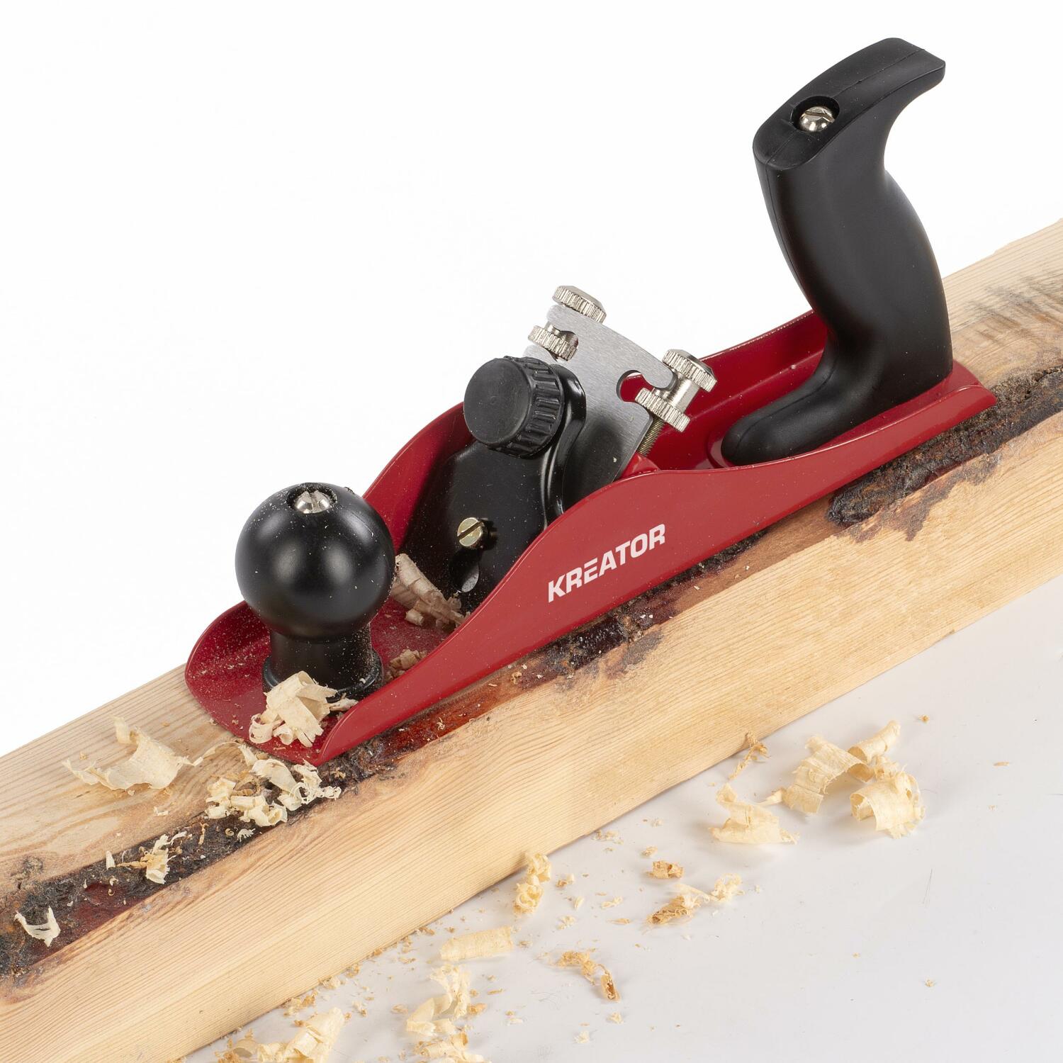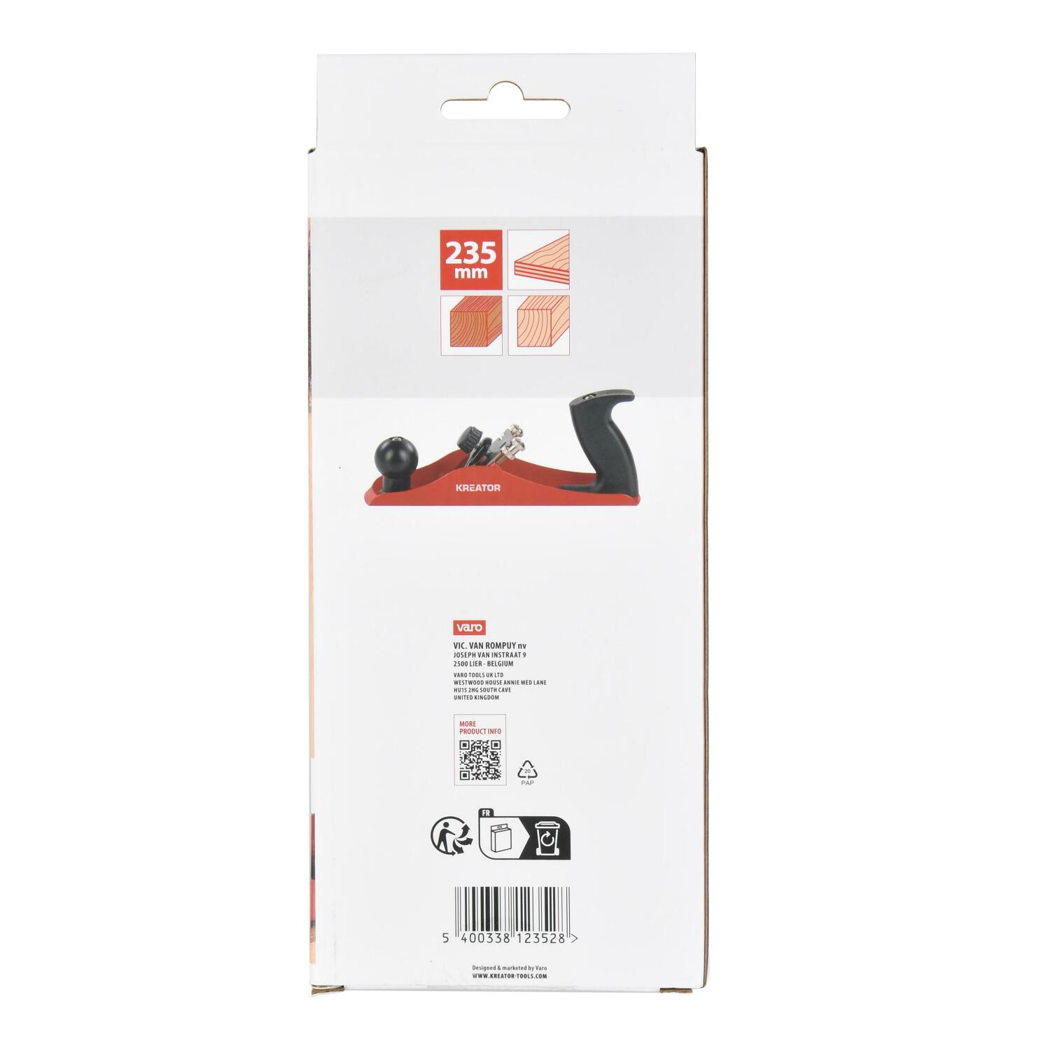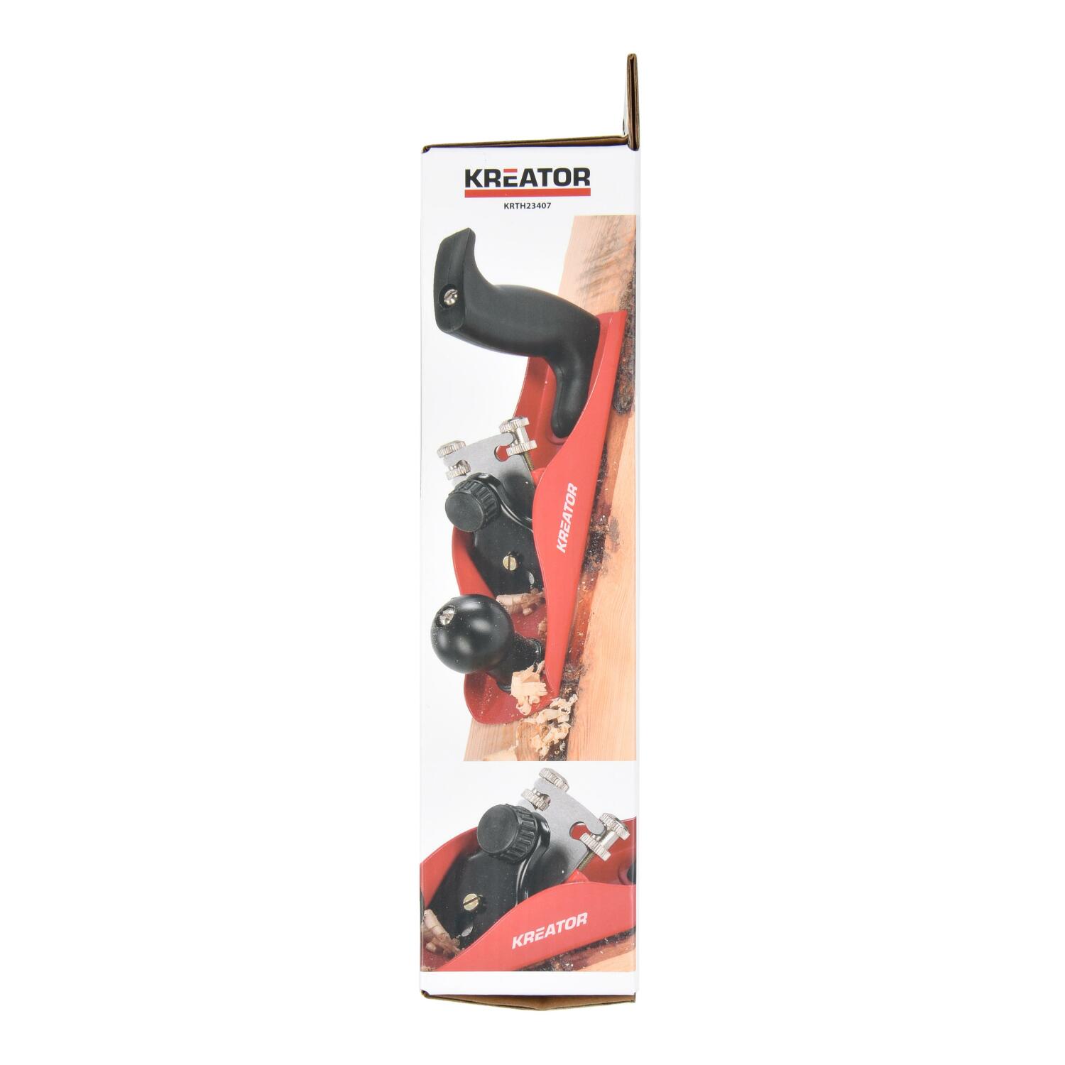 The KREATOR KRTH23407 Block Plane 45x235mm is ideal for planing, reducing thickness, and smoothing uneven wooden surfaces. This 235 mm block plane features a sturdy chisel made from 65Mn steel, ensuring it remains extremely sharp and wear-resistant. With a working width of 105 mm and two handles, it offers comfortable use.