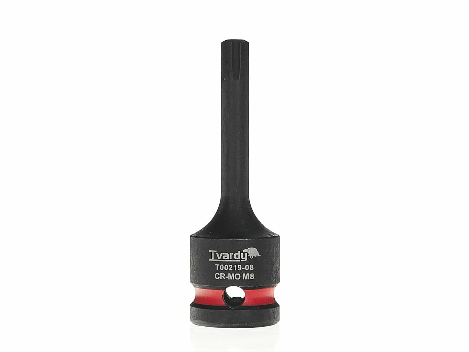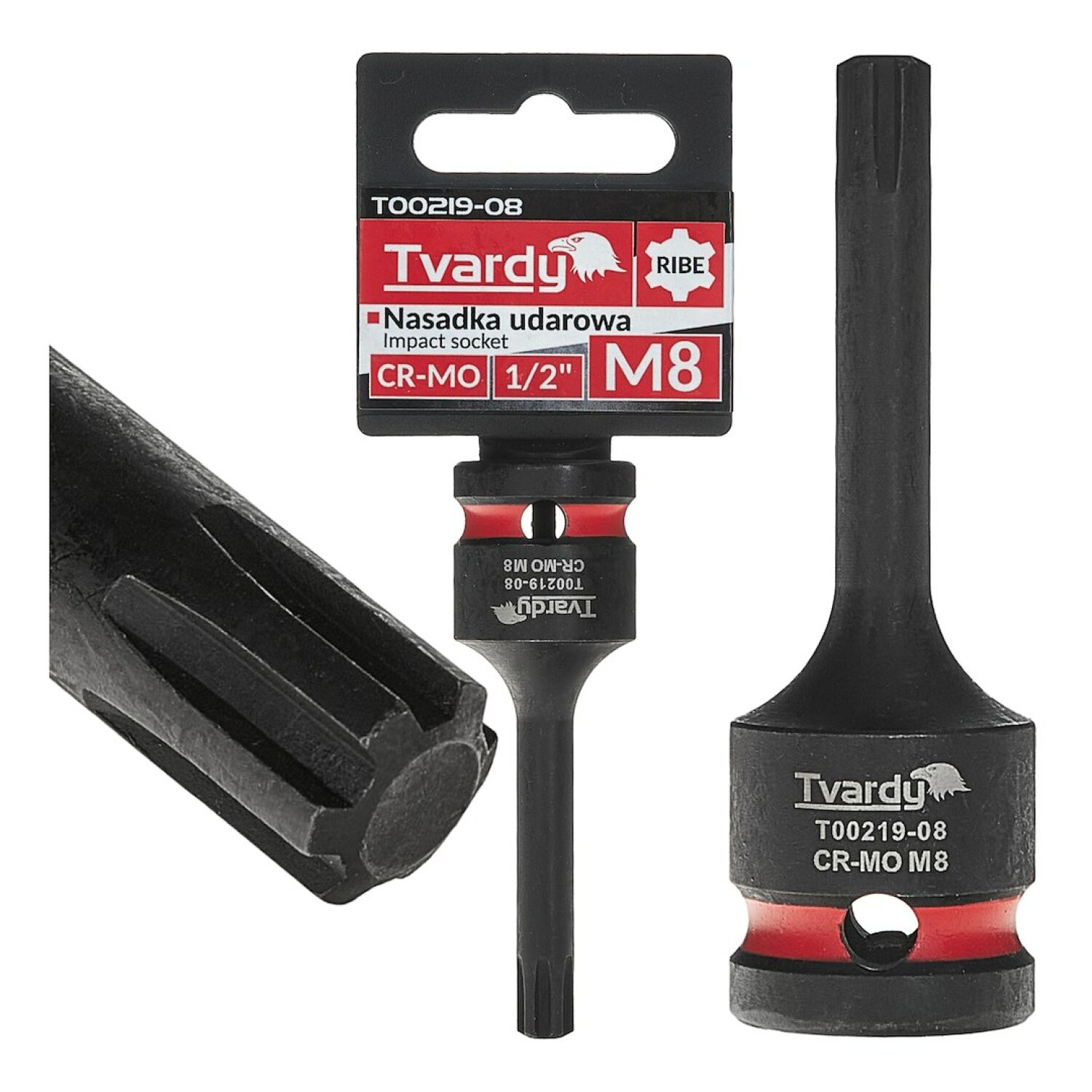 The RIBE impact socket 1/2" M8 CR-MO by Tvardy is designed for heavy-duty use with impact wrenches. It's an essential tool in automotive workshops, industrial settings, and for assembling structures utilizing RIBE socket connections.