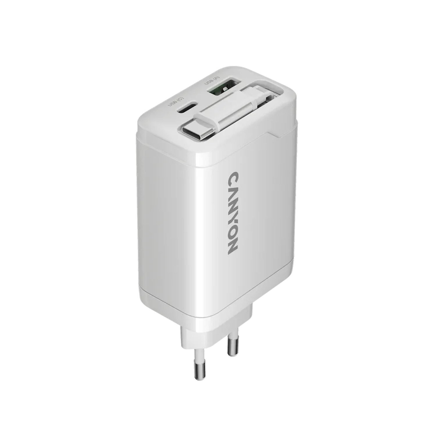 CANYON OnCharge 65RC is a powerful and compact wall charger with an integrated USB-C cable and a total output power of up to 65 watts. It combines Power Delivery and Quick Charge technologies in a single device, providing fast, safe, and convenient charging without extra cables. An ideal solution for home, work, and travel.