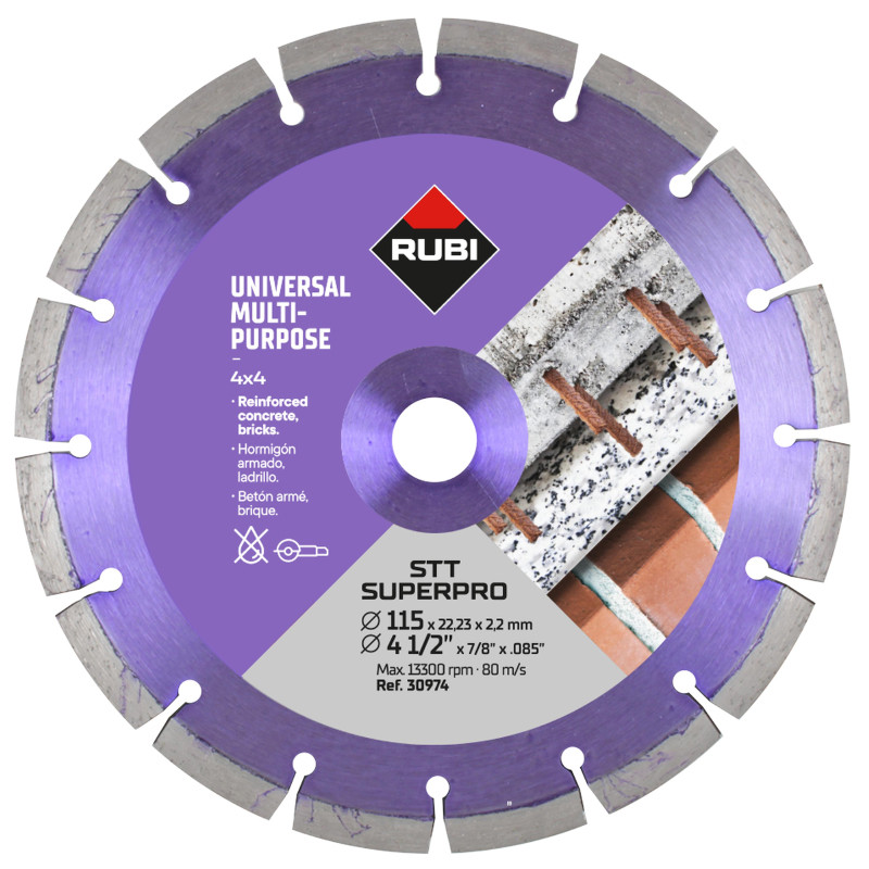 RUBI MULTIPURPOSE STT dimanta asmens ir ieteicams jebkura būvmateriāla, piemēram, ķieģeļu, teraco, betona uc, sausai griešanai ar slīpmašīnu.