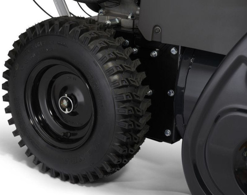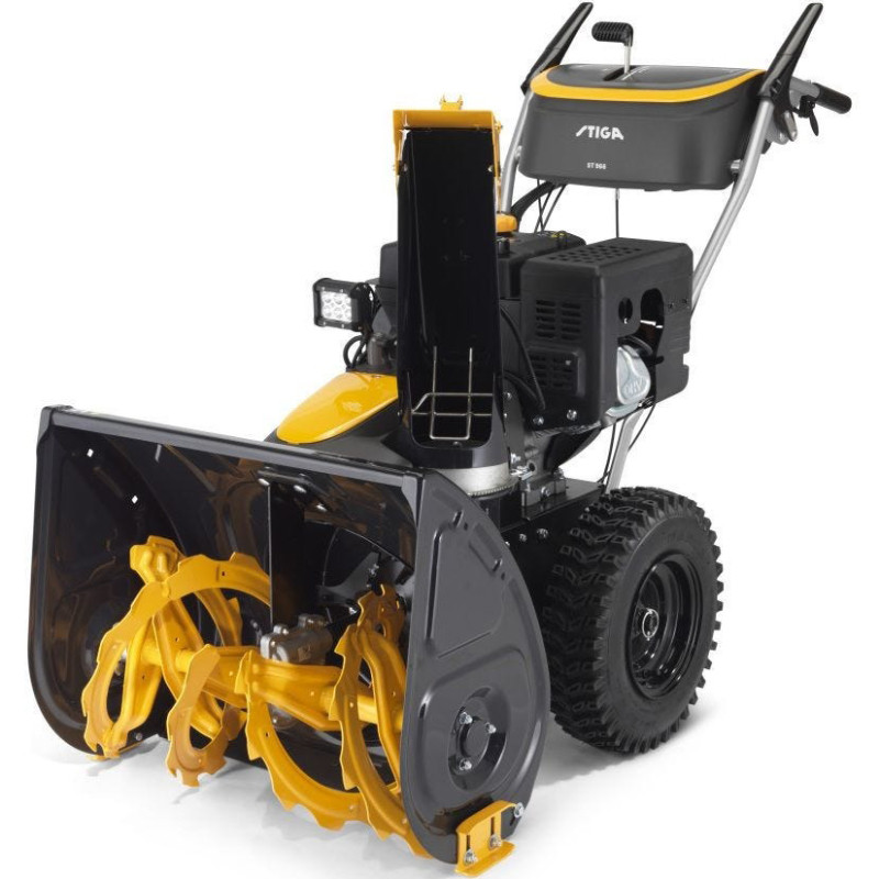 STIGA ST 966 ir divpakāpju sniega pūtējs ar 66 cm darba platumu un 16 collu lieliem sniega riepām.