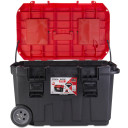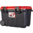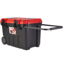 RUBI profesionālajai instrumentu kastei ir divi lieli gumijas riteņi un izvelkamais rokturis ērtai transportēšanai un apstrādei.