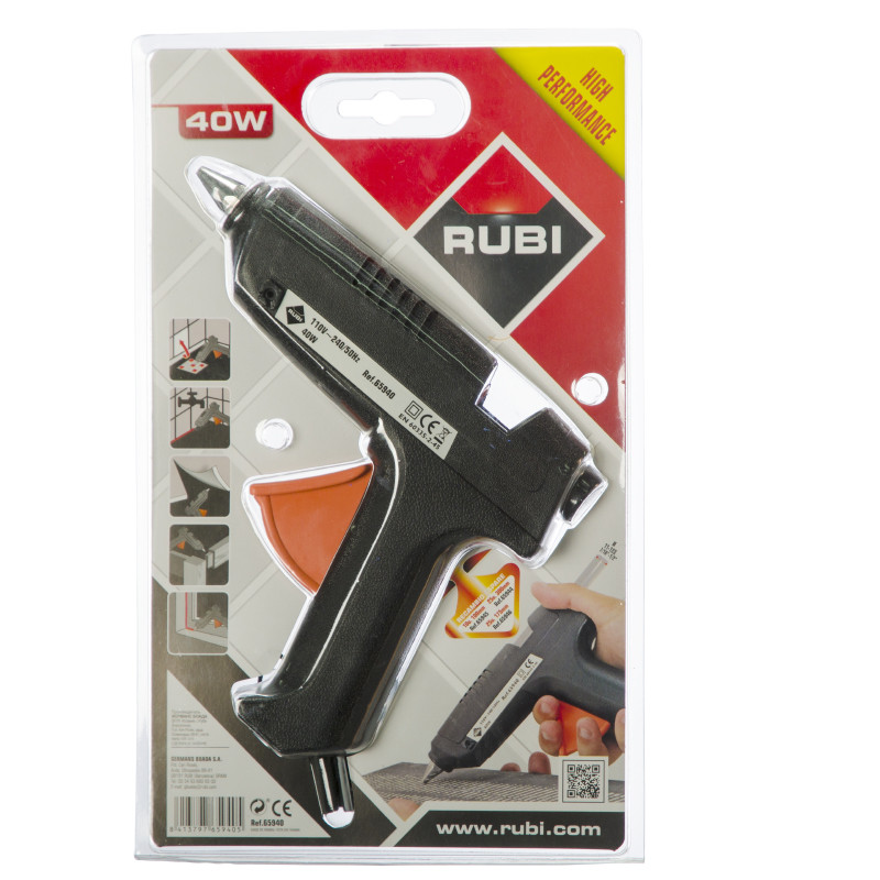 RUBI līmes pistoles aplikatora jauda ir 40 W, un tas darbojas temperatūrā no 160 ~ 180°C. Lai sasniegtu stieņu optimālo darba temperatūru (140–170°C), nepieciešamas tikai 5 līdz 10 minūtes.