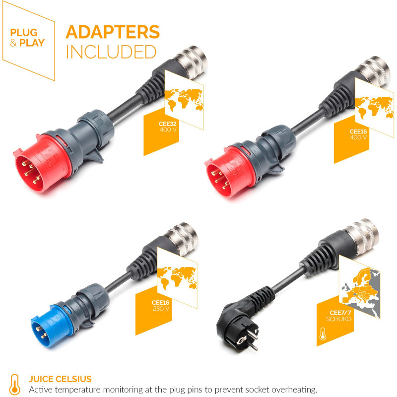 Patentētā JUICE CONNECTOR savienotāju sistēma atpazīst vairāk nekā 30 dažādus adapteru spraudņus, un uzlādes stiprums tiek automātiski iestatīts pareizi.