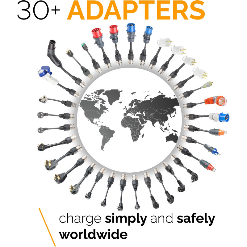 Country EU Traveler komplektā ietilpst arī četri dažādi adapteri (CEE16 400 V, CEE32 400 V, CEE16 230 V, zemējuma kontakts CEE 7/7 DE).