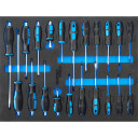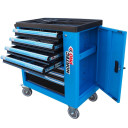 Aprīkots ar 4 lieliem riteņiem, tai skaitā diviem grozāmiem ritentiņiem ar bremzi. Ērts rokturis ļauj brīvi pārvietot ratiņus, turklāt skapis ir aprīkots ar atvilktnēm, no kurām 6 ir piepildītas ar augstas klases cietā tērauda darba instrumentiem.
