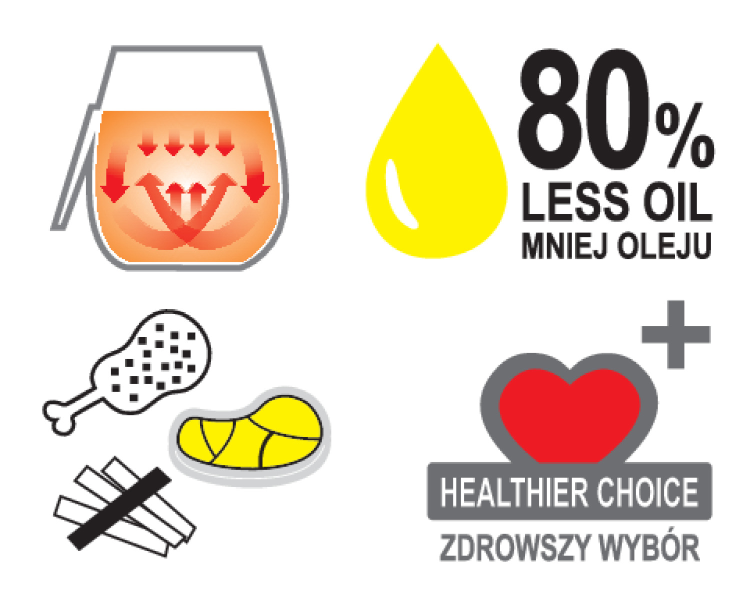 GATAVOŠANA AR GAISU - fritētāja kontūrveida forma un gaisa termo-cirkulācija nodrošinās, ka pārtika tiek vienmērīgi uzsildīta, tādējādi kļūstot kraukšķīga no ārpuses un mīksta iekšpusē.