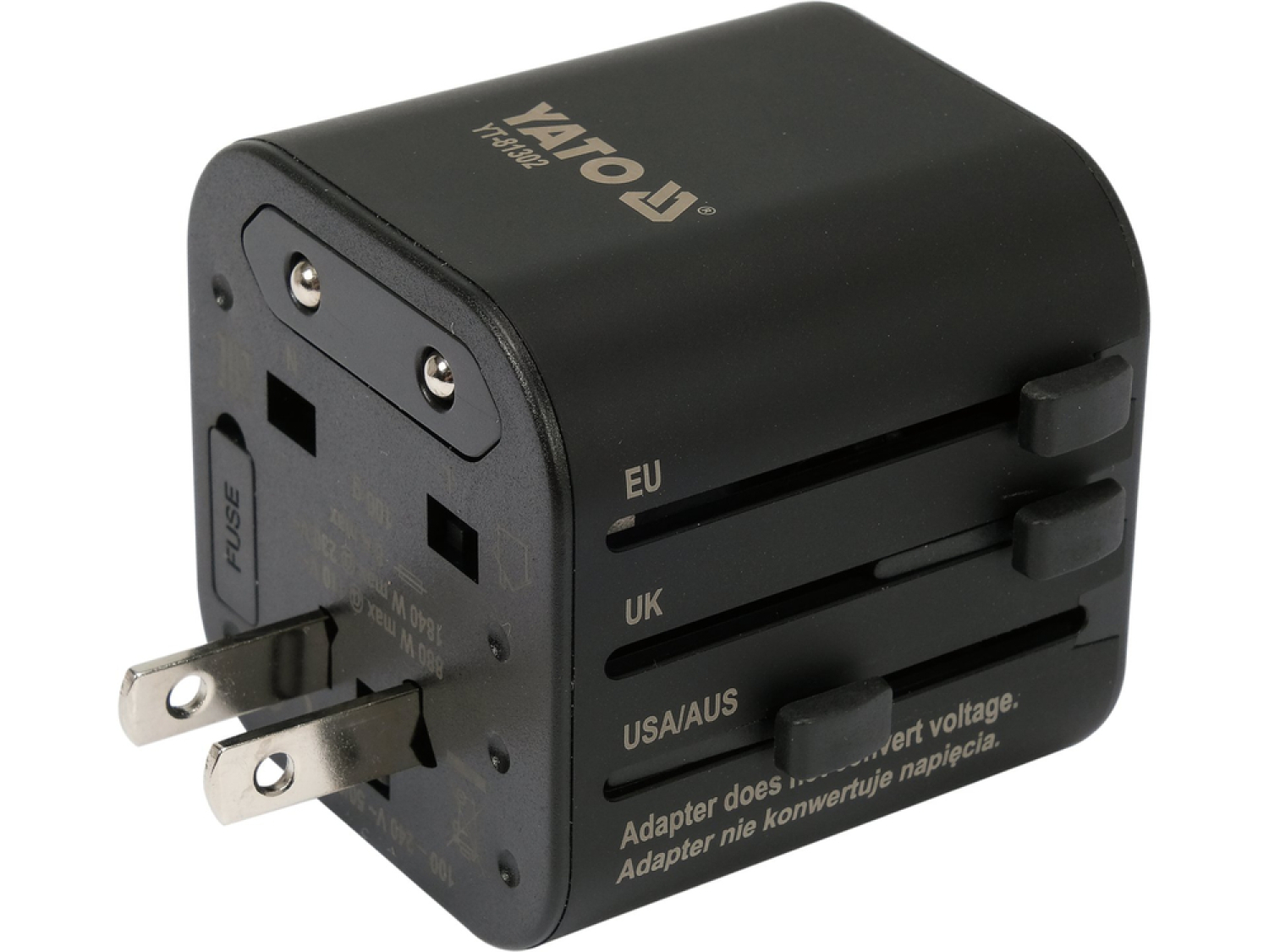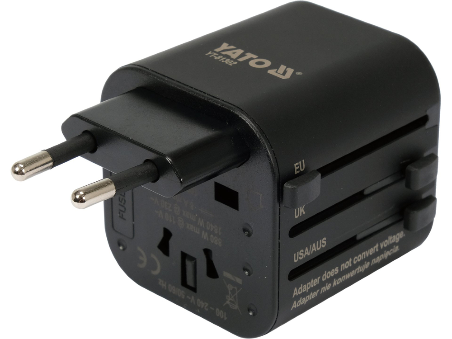 Universālais ceļojuma adapters YATO YT-81302 ir izstrādāts, lai nodrošinātu savienojamību vairāk nekā 150 valstīs.