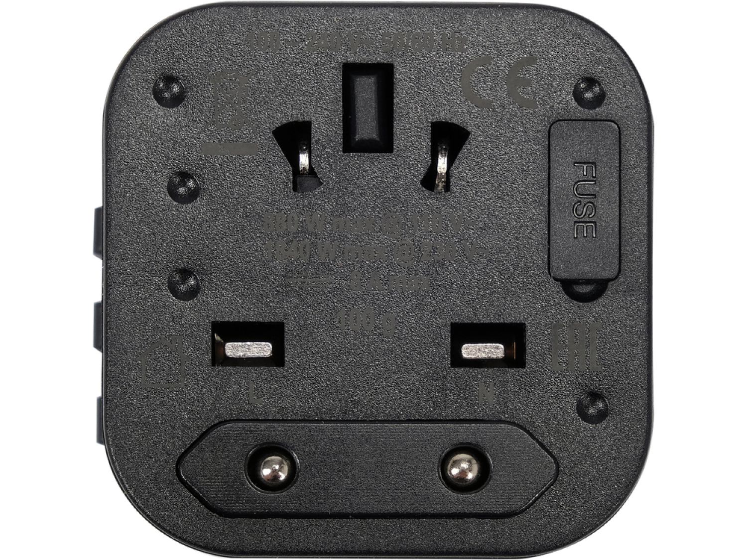 Šim adapterim ir izvelkami spraudņi ar bloķēšanas mehānismiem, kas novērš spraudņu atkārtotu iekļūšanu korpusā. Tas ir aizsargāts pret īssavienojumu ar viegli pieejamu keramisko drošinātāju. Adaptera korpuss ir izgatavots no izturīga, ugunsizturīga plastmasas.