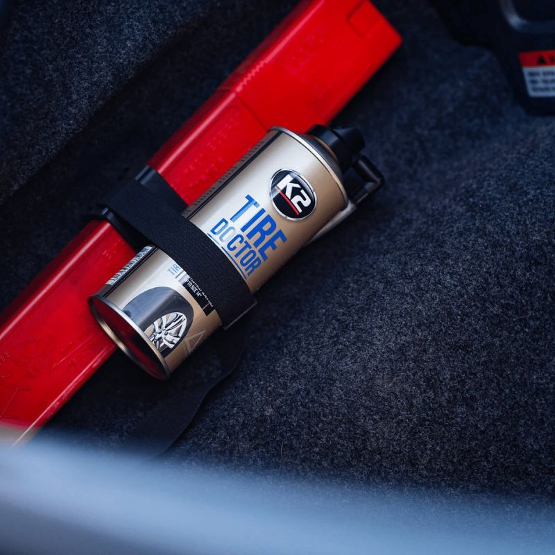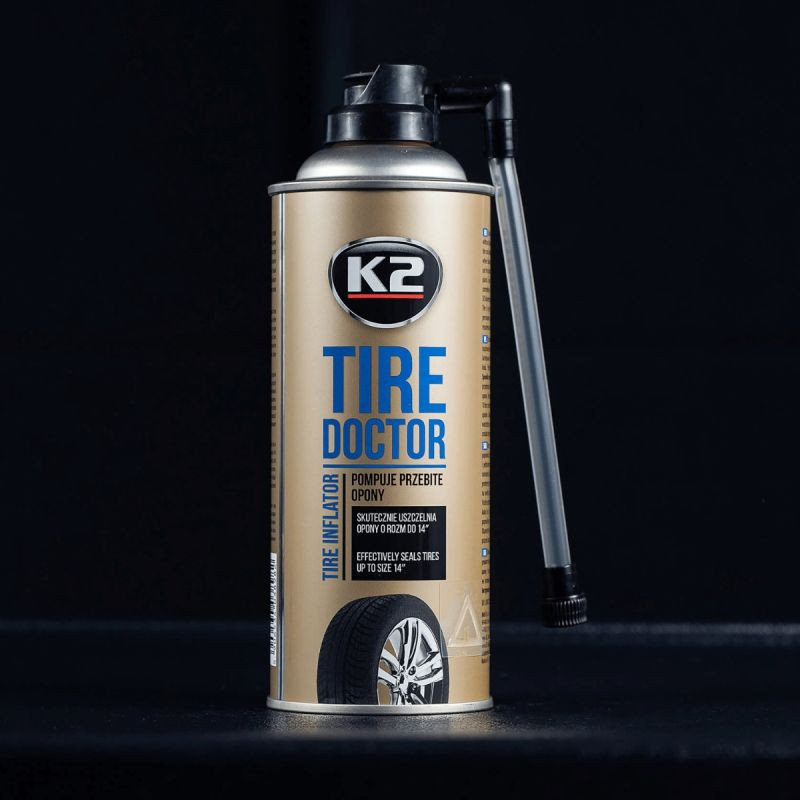 K2 TIRE DOKTOR ātri un efektīvi sūknē un noblīvē plīsušās riepas – pagaidu remonts bez demontāžas un instrumentu izmantošanas. Aerosols sūknē riepu, un īpaša lateksa formula noblīvē caurumu. Sagatavošana neietekmē riteņu līdzsvaru.
