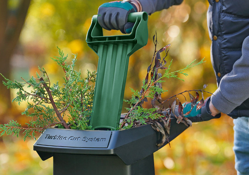 Ātra un jaudīga koksnes un dārza atkritumu smalcināšana ar turbīnas tipa smalcināšanas tehnoloģiju. Turbīnas tipa smalcināšanas tehnoloģija sniedz ātru koka un dārza atkritumu smalcināšanu bez liekām raizēm Spēcīga, efektīva smalcināšana ar lielu veiktspēju; bezsuku 2500 W indukcijas motors Darbojas klusām, pateicoties zema līmeņa trokšņa emisiju konstrukcijai Lielas ietilpības smalcināšana ar automatizētu ātrās padeves piltuvi Liela 53 l savācējtvertne ir retāk jāiztukšo Parocīga uzglabāšana, noņemot reni, lai samazinātu smalcinātāju līdz tikai 67 cm Jaudīga un ātra koksnes un smagu dārza atkritumu smalcināšana ar turbīnas tipa smalcināšanas tehnoloģiju. AXT 25 TC ātri tiek galā ar lieliem dārza augu smalcināšanas darbiem, pateicoties unikāliem turbīnas tipa smalcināšanas asmeņiem un ļoti spēcīgam, bezsuku 2500 W indukcijas motoram. Klusām un vienmērīgi, izturīgais smalcinātājs sagriež biezu koksni un smagus dārza atkritumus, kas veido perfektu kompostu vai mulču. AXT 25 TC ir augstas veiktspējas, iespaidīgi kluss dārza atkritumu smalcinātājs, kas vienā acumirklī pārvērš dārza atkritumus ar barības vielām bagātos atgriezumos. Jaudīgais, bezsuku 2500 W indukcijas motors un unikālā turbīnas tipa smalcināšanas tehnoloģija ir apvienota, lai sasmalcinātu zarus, kas var būt pat 45mm resni, sīkstus, ērkšķainus krūmus un lapas saturošus dārza atkritumus. Automatizētā ātrās padeves piltuve saķer zarus un ievelk tos smalcināšanas sistēmā, kamēr praktiskais virzulis droši vada mīkstākus materiālus un ir īpaši noderīgs, strādājot ar ērkšķainiem krūmiem. Savācējtvertnes ietilpība ir bagātīga: 53 litri, kas nozīmē retākus iztukšošanas gājienus uz komposta kaudzi. Sasmalcinātie atgriezumi aizņem mazāk vietas zaļajās atkritumu tvertnēs un tie veido lielisku kompostu vai mulču. Lai nodrošinātu vienkāršu un kompaktu uzglabāšanu, piltuve ir parocīgi uzglabājama savākšanas tvertnē, lai smalcinātājs kļūtu tikai 67 cm garš.