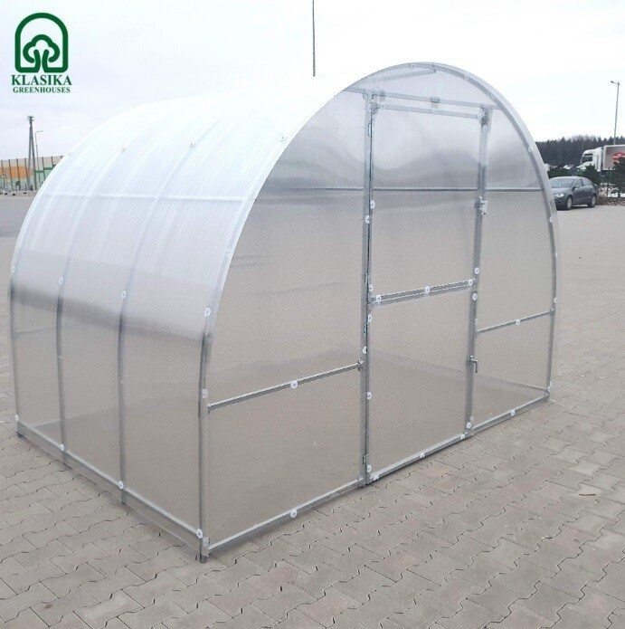 Siltumnīca KLASIKA EASY - ražota un projektēta Lietuvā, uzticama, izturīga, pateicoties vienkāršai konstrukcijai - viegli montējama. Tā ir siltumnīca, kas lieliski piemērota dažādu kultūru audzēšanai. Šis modelis ir izturīgs, jo siltumnīcas profili ir izgatavoti no 20x20 mm cinkotas tērauda caurules. Attālums starp arkām ir 67 cm. Rāmis ir samontēts ar M5 skrūvēm. Cinkotās caurules atbilst īpaši augstām kvalitātes prasībām. Siltumnīca ir aprīkota ar stiprinājuma kājiņām, kuras tiek ieraktas zemē ~ 35 cm dziļumā. Metināšanas neizmantošana ražošanā. Lai savienotu arkas, tiek izmantots īpaša tehnoloģija, kas ļauj ātri un bez metināšanas savienot caurules. Priekšpuse un aizmugure ir samontētas, izmantojot KRAB sistēmu. Iepakojums ir ērts transportēšanai. Pārklājumam izmantots tikai kvalitatīvs, Eiropas, 4mm vai 6mm biezu kanālu polikarbonāts, kas nodrošina tā izturību un izcilas siltumizolācijas īpašības.