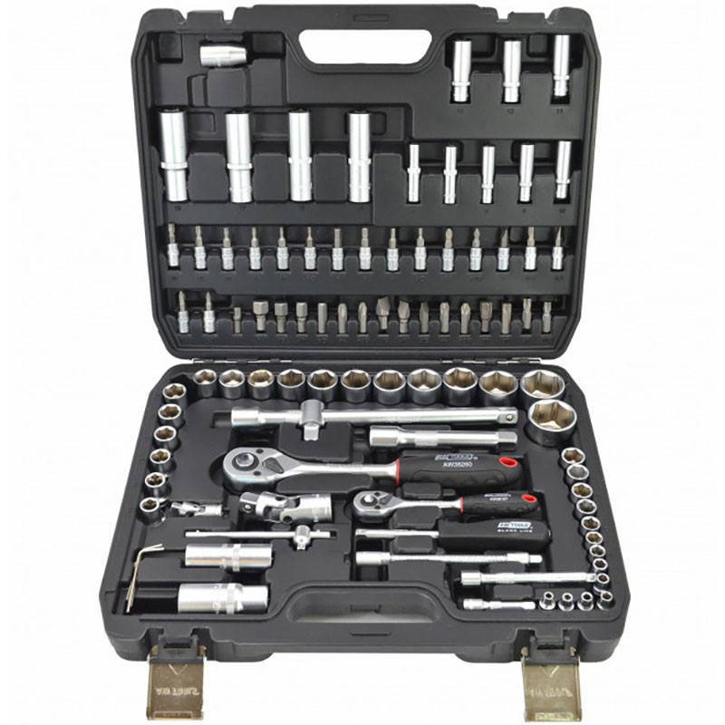 Komplektā ietilpst ligzdas, rokturi, pagarinājumi, adapteri, sešstūra atslēgas, skrūvgriežu uzgaļi un citi piederumi.