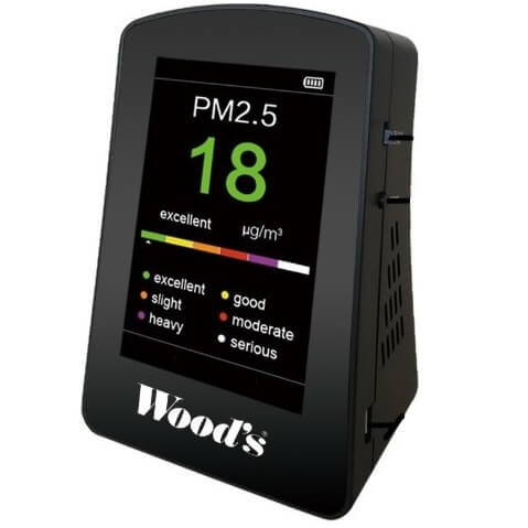 Pārnēsājamais gaisa kvalitātes sensors. Šī lāzera tehnoloģija PM1, PM2.5 un PM10 cietvielu putekļu mērīšanai un noteikšanai (piemēram, PM 2,5 nepieciešama ierīce ar 2,5 mikronu uztveršanas ierīci un mazākām daļiņām diametrā) 5 metru rādiusā.