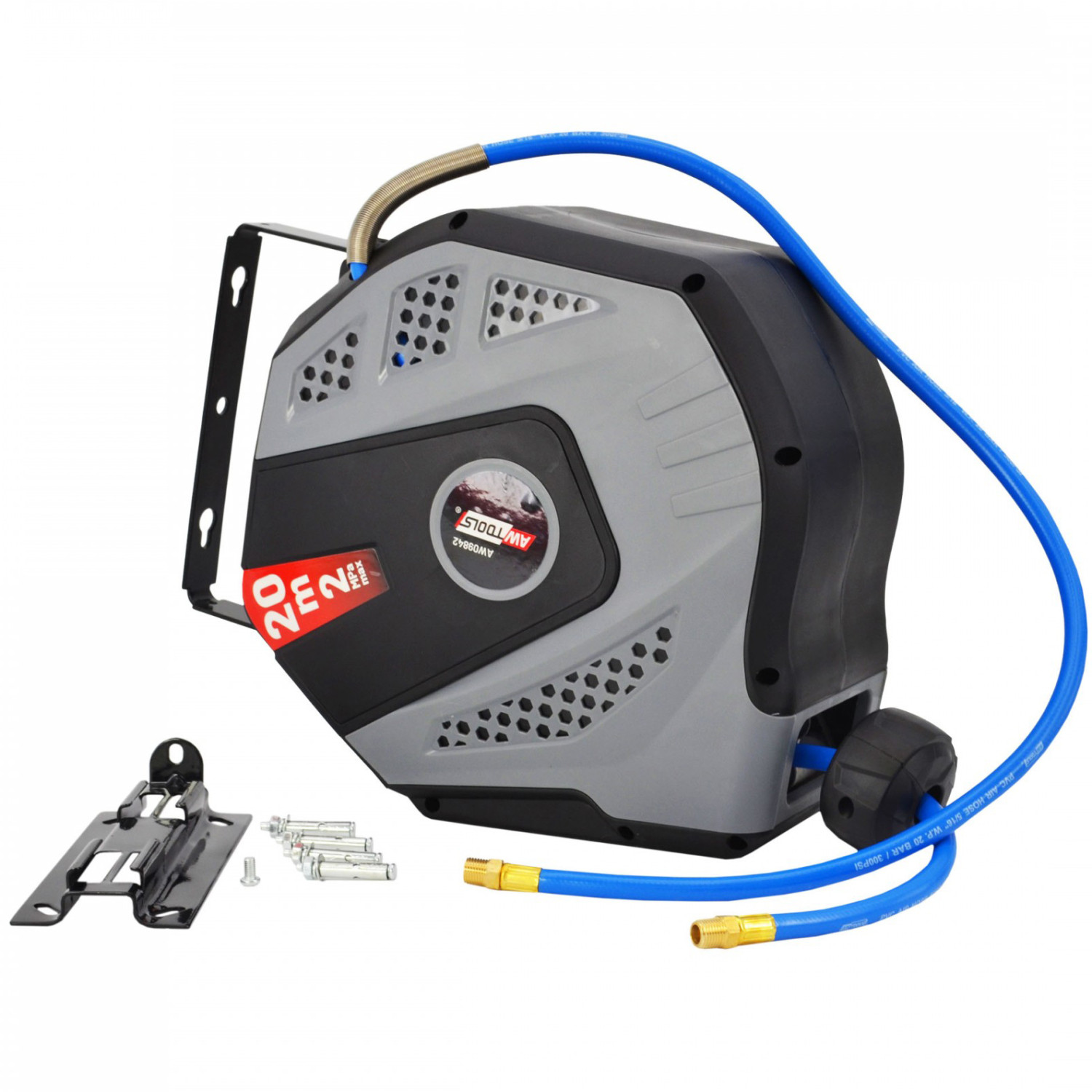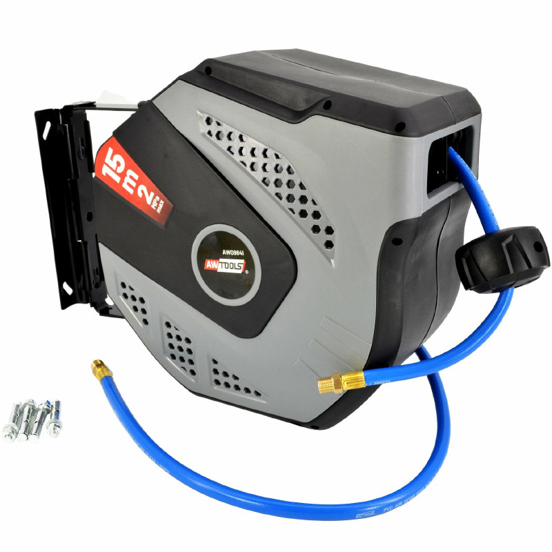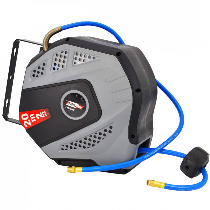 Aprīkots ar automātiskās attīšanas mehānismu un plastmasas bremžu lodi, lai novērstu šļūtenes saripošanu.