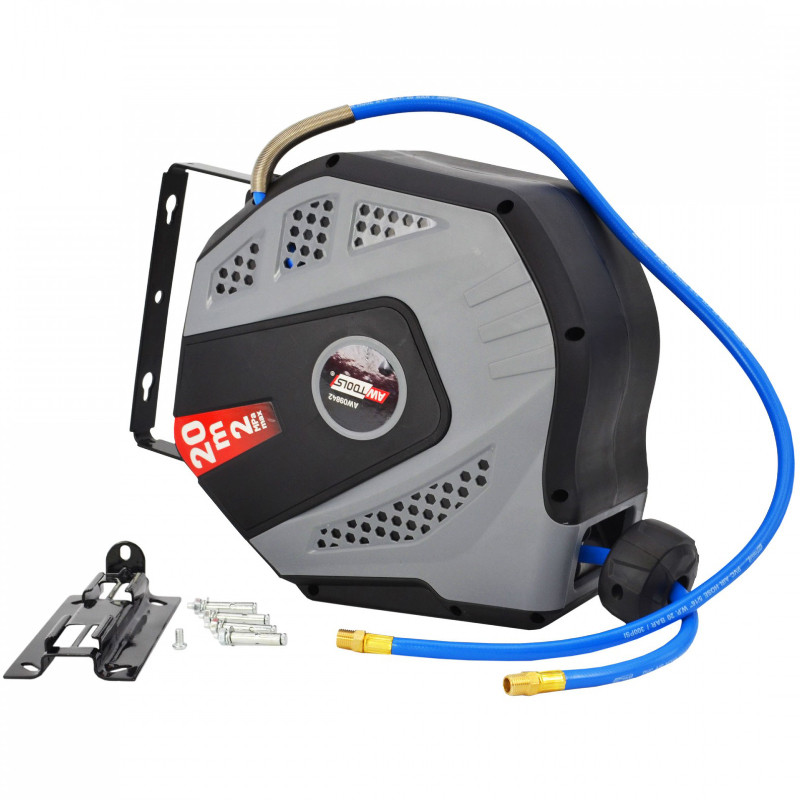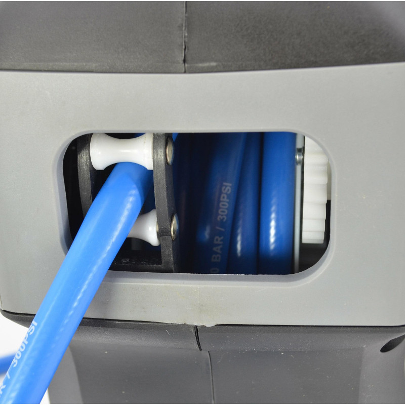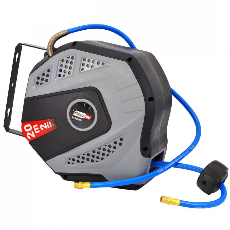Aprīkots ar automātiskās attīšanas mehānismu un plastmasas bremžu lodi, lai novērstu šļūtenes saripošanu.