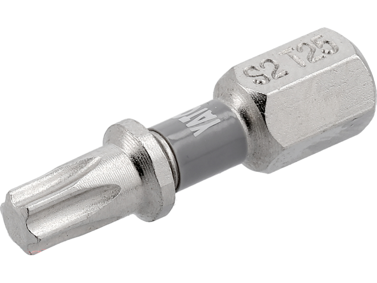 YATO skrūvgriežu uzgaļu komplekts, modelis YT-78014, ietver divus 1/4" T25 uzgaļus, katrs 25 mm garš. Tie ir izgatavoti no S2 tērauda un pārklāti ar niķeli, nodrošinot augstu izturību ar cietības līmeni 58-60 HRC.