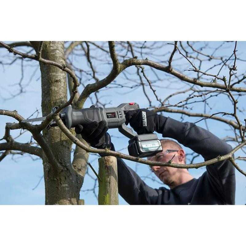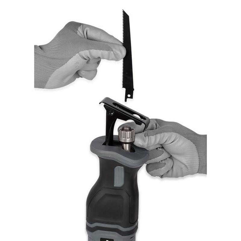 Abpusējs zāģis ir aprīkots ar ātrās asmens maiņas sistēmu ātrai un ērtai zāģa asmens maiņai bez instrumentiem. Komplektā divi zāģa asmeņi (koks + metāls).