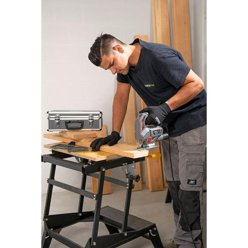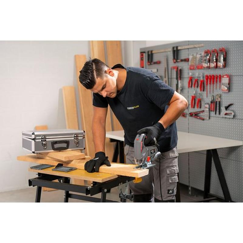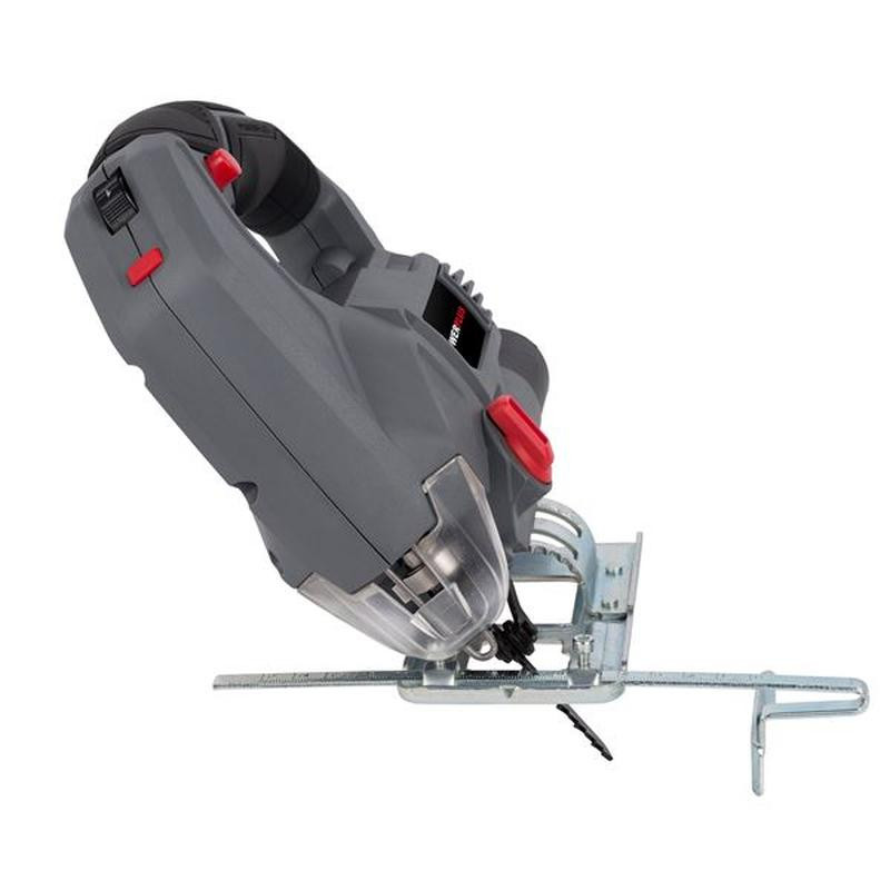 Kompaktais finierzāģis ir ļoti elastīgs. Pateicoties sānu vadotnei, varat to izmantot, lai zāģētu precīzus līkumus un līkumus, kā arī perfekti taisnas līnijas. Pēdu var pagriezt, lai zāģētu slīpētus stūrus līdz pat 45°. Tas viegli griež dažādus materiālus: (cieto) koku, metālu, keramiku, plastmasu un citus. Ar izvēli starp 4 svārsta pozīcijām un 6 ātruma iestatījumiem.