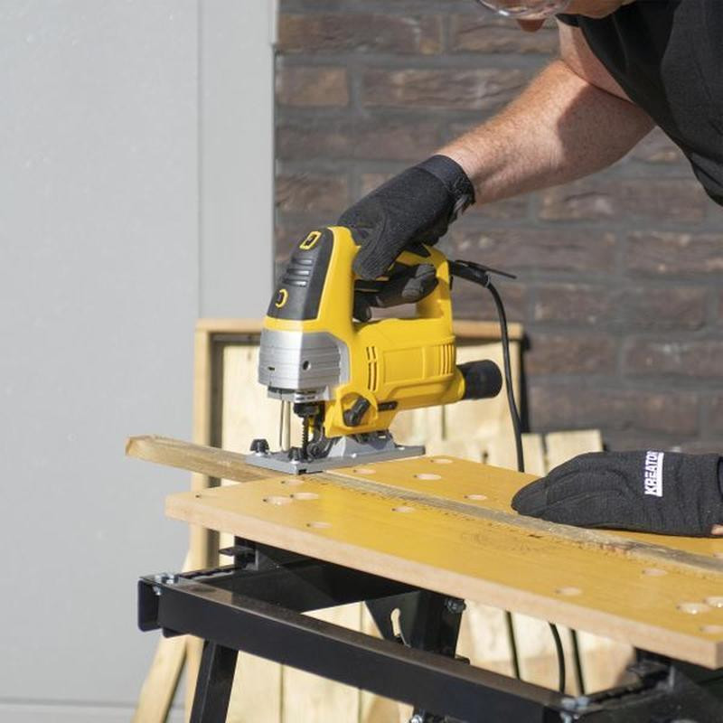 Šo finierzāģi var izmantot, lai izgrieztu neregulāras formas, kā arī lai izveidotu taisnus vai slīpētus griezumus. Tas ir aprīkots ar izturīgu sānu virzošo sliedi, iebūvētu lāzeru un regulējamu apavu. Jūs varat griezt līdz 8 mm tēraudā, 80 mm plastmasā un līdz 80 mm dziļumā kokā.