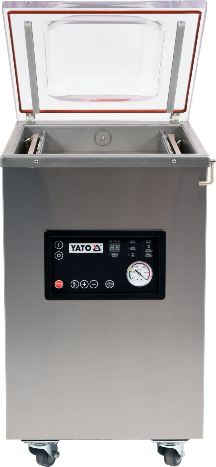 YATO brīvi stāvošā vakuuma iepakošanas iekārta ar iepakošanas platumu 420mm ir neaizvietojams palīgs jebkurā ēdināšanas iestādē. Šī iekārta ļauj vakuuma veidā iepakot pārtiku, kas bez skābekļa saglabā svaigumu daudz ilgāk. Šādā veidā iepakoti produkti var tikt uzglabāti ledusskapī vai saldētavā ilgu laiku, samazinot atkritumu apjomu, kas saistīts ar neizmantoto produktu izmešanu vai to derīguma termiņa tuvošanos. Tas arī sniedz iespēju uzglabāt sezonālos produktus. Vakuuma iepakošana ir ideāla arī marinēšanai, jo vakuums ļauj marinādei dziļāk iekļūt produktā, sasniedzot daudz labākus rezultātus salīdzinājumā ar tradicionālajām metodēm. Tas ir būtiski arī populārā sous vide pagatavošanā. Augstas kvalitātes sūknis ar jaudu līdz 20m³/h un iepakošanas josla ar platumu līdz 420mm, kas uzstādīta abās kameras pusēs, nodrošina ļoti ātru pat lielu maisiņu iepakošanu. Pilnībā automātiska iepakošanas procesa un iespēja regulēt iepakošanas laiku padara darbu daudz vieglāku un ātrāku. Iekārtas digitālais displejs un spiediena indikators ir viegli lasāmi, nodrošinot pilnīgu kontroli pār visu iepakošanas procesu. YATO vakuuma iepakošanas iekārta ir izgatavota no augstākās kvalitātes izejvielām. Vakuuma kamera, kuras izmēri ir 440x310x75 (125) mm, ir izgatavota no bieza un izturīga nerūsējošā tērauda, kas garantē ļoti ilgu kalpošanas laiku. Noapaļotās formas atvieglo tīrīšanu. Iepakošanas iekārtas vāks ir izgatavots no ļoti izturīga caurspīdīga plastmasas, ļaujot sekot iepakošanas procesam un pilnībā to kontrolēt. Turklāt vāka iedobums palielina kameras augstumu no 75mm līdz 125mm, ļaujot iepakot lielākus produktus. YATO brīvi stāvošās iepakošanas iekārtas ārējie izmēri ir 555x475x910mm, un tās svars ir 73kg. Iekārtai ir 900W jauda un tā darbojas ar 230V ~50Hz. Indekss: YG-09310
