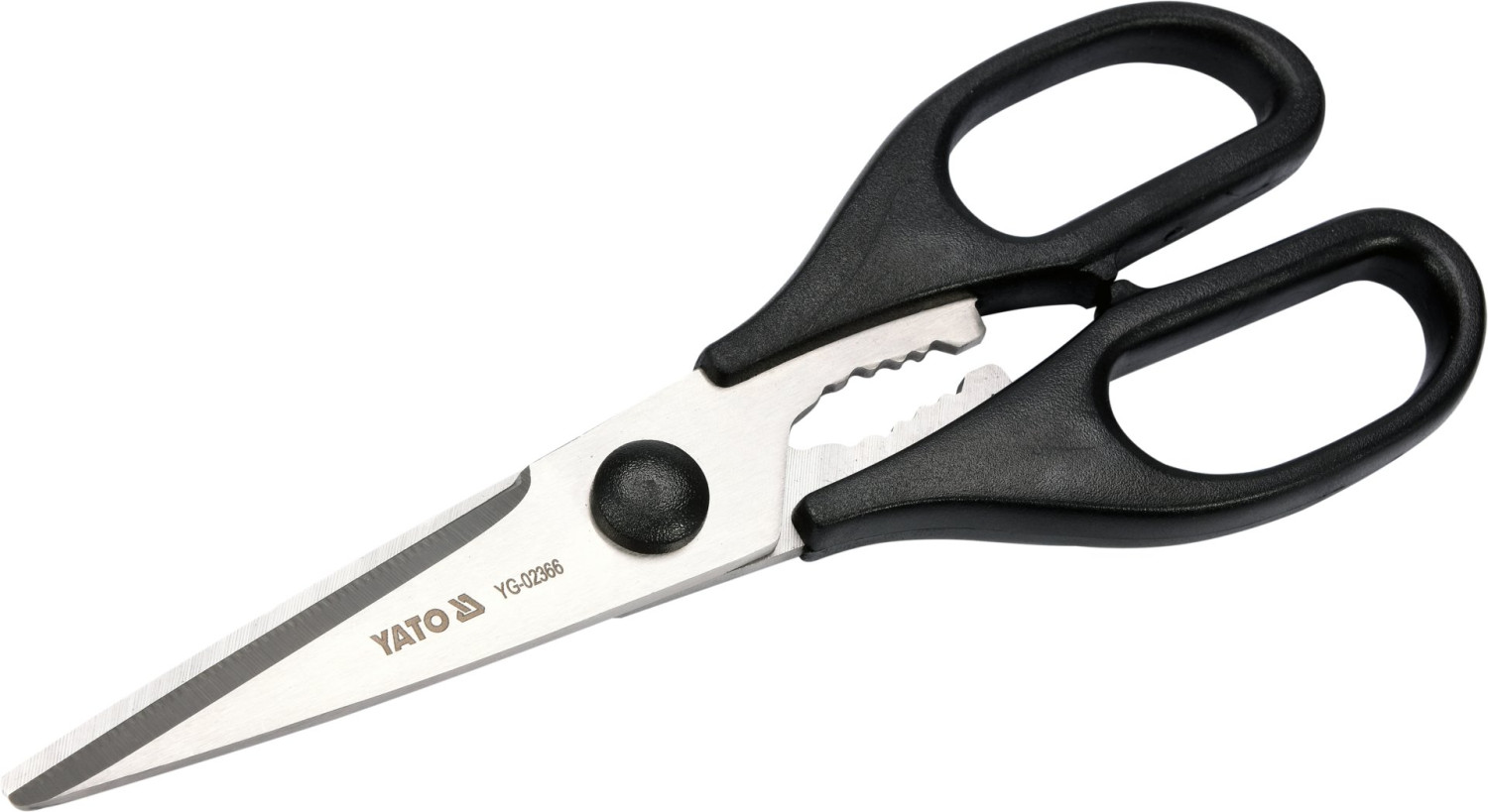 Universālas virtuves šķēres. Šķēres izgatavotas no augstas kvalitātes 2CR13 nerūsējošā tērauda, kas, pateicoties tā cietībai, bieži tiek izmantots asmeņu ražošanā. Tas nodrošina ļoti ilgu kalpošanas laiku un izcilu veiktspēju. Asmens garums ir 70 mm, biezums - 3.0 mm, un tam ir papildu zāģēta mala, kas garantē precīzu griešanu. Šķēres īpaši ieteicamas lietošanai ēdināšanā. Tām ir izklājamie asmeņi, tādējādi ir iespēja precīzi notīrīt pat visgrūtāk pieejamās vietas. Turklāt YATO šķēres ir aprīkotas ar riekstu atvērēju. Ergonomiskie un ļoti ērti rokturi palielina darba komfortu. Tās ir paredzētas arī kreisās rokas lietotājiem. Šķēru kopējais garums ir 210 mm. Indekss: YG-02366