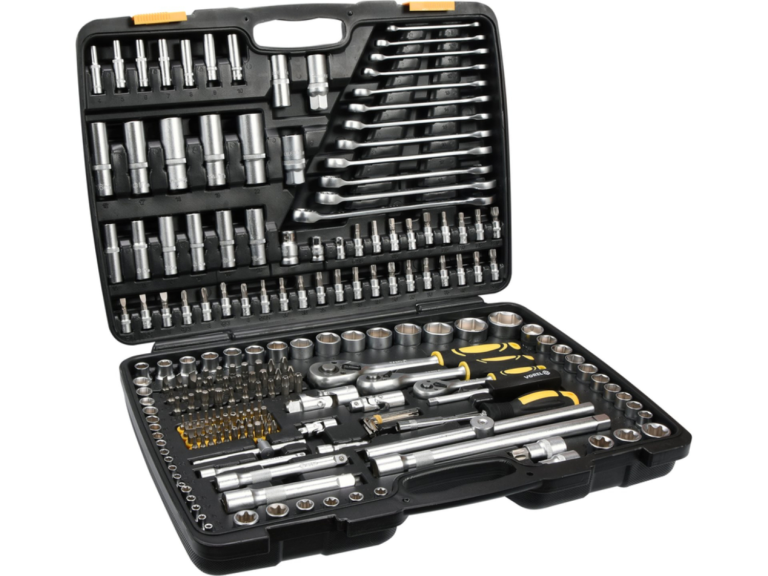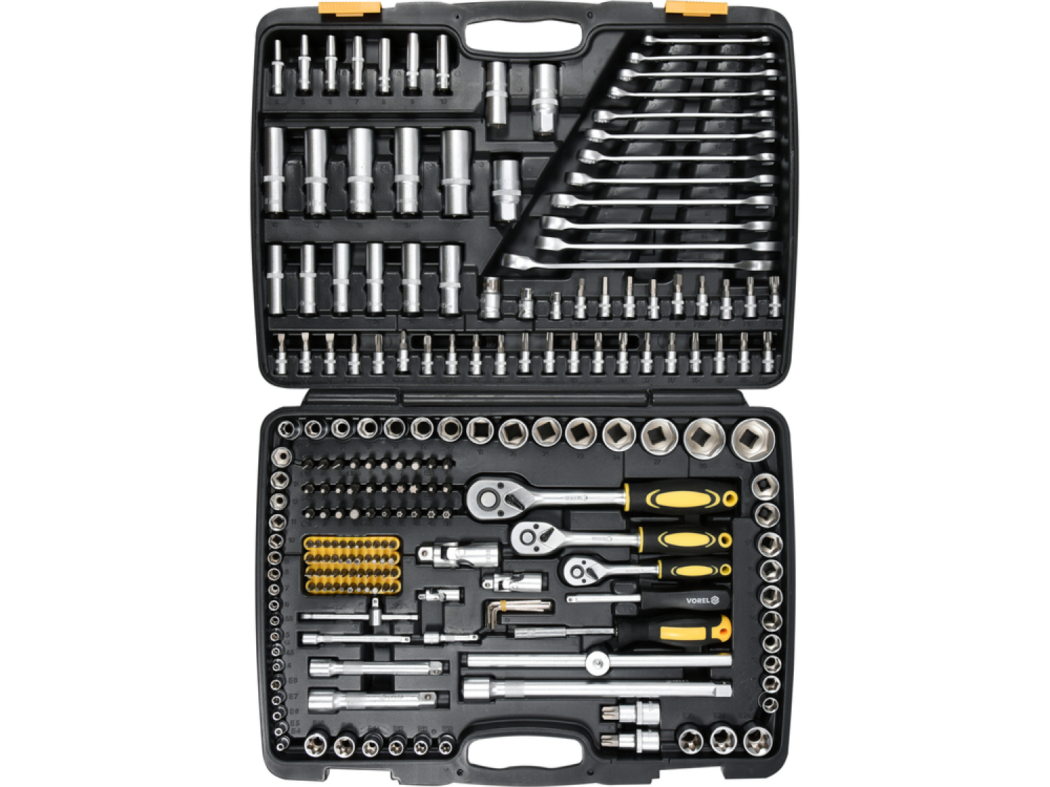 VOREL 58700 instrumentu komplekts sastāv no 216 elementiem, kas ērti novietoti plastmasas koferī. Rīki ir precīzi izgatavoti no materiāliem, kas nodrošina to uzticamību. Komplektā ir pilns garo un īso uzgali klāsts 1/4", 3/8" un 1/2", pagarinājumi, kardāna locītavas un daudzi citi elementi, tostarp 45 zobu ratlīši. Šī konfigurācija padara komplektu piemērotu mazākiem montāžas darbiem, mehāniskām remontdarbiem un daudzām citām aktivitātēm mājsaimniecībā vai darbnīcā.