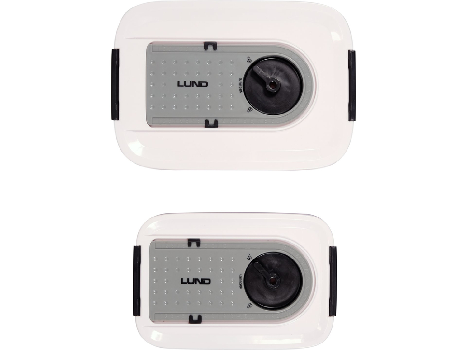 Divu 0.75l un 1.5l vakuuma konteineru komplekts no LUND zīmola. Augstas kvalitātes materiāli nodrošina izturību, iespēju atkārtoti sildīt pārtiku mikroviļņu krāsnī un mazgāt trauku mazgājamajā mašīnā. Papildu priekšrocība ir iespēja atzīmēt datumu uz vāka.