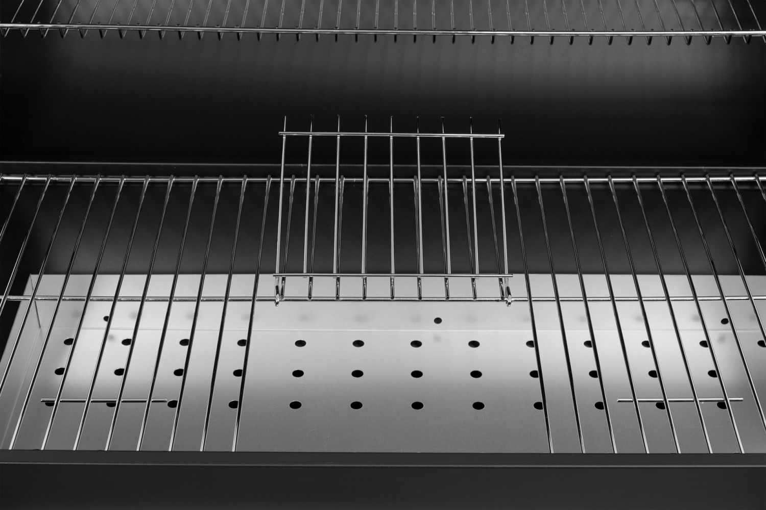 Apakšējais plaukts atvieglo aksesuāru un ogļu uzglabāšanu.