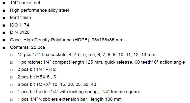 • 1gab. tarkšķatslēga 1/4" kompakts garums 125 mm, 60 zobi/ 6° darba leņķis, ātrās fiksācijas sistēma