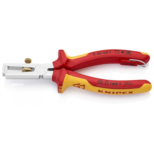Izolācijas noņēmējs ar atvēršanas atsperi, universāls, hromēts, ar izolētām rokturiem, kas pārbaudīti saskaņā ar VDE. Iebūvēta izolēta piekļuves punkts rīka piekarei. Piemērots vienkāršiem, vairākiem un smalkiem vadiem ar plastmasas vai gumijas izolāciju līdz 5.0 mm diametrā vai 10 mm² kabeļa šķērsgriezumā. Viegla regulēšana nepieciešamajam diametram cietajiem vai vītajiem vadiem ar rievojumu skrūvi un fiksācijas uzgriezni. Izgatavots no īpašas instrumentu tērauda, kalts, eļļas cietināts.
