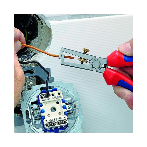 Izolācijas noņēmējs ar atvēršanas atsperi, universāls, hromēts, ar daudzkomponentu rokturiem. Paredzēts vienkāršiem, vairākiem un smalkiem vadiem ar plastmasas vai gumijas izolāciju līdz 5.0 mm diametrā vai 10 mm² kabeļa šķērsgriezumā. Viegli pielāgojams nepieciešamajam diametram cietajiem vai vītajiem vadiem ar rievotu skrūvi un bloķējošo uzgriezni. Izgatavots no īpašas instrumentu tērauda, kalts, eļļas cietināts. Hromēti standarta vadu noņēmēji standarta izolācijas materiāliem. Paredzēts plastmasas un gumijas izolācijas materiāliem. Knipex 11 05 160 galvenokārt tiek izmantots NYM kabeļa (NYM nozīmē "standartizēts kabelis / PVC vadu izolācija / apvalkotais kabelis") elektroinstalācijai. Montētāji, kuri vēlas vienā darba solī pieslēgt lielu skaitu kontaktligzdu, vienlaikus konsekventi noņemot 1.5 mm² vadu izolāciju, ir atraduši pareizo instrumentu, lai noņemtu izolāciju no vadiem līdz ø 5 mm vai 10 mm² šķērsgriezumam. Šīs knaibles ir arī piemērotas elastīgu vadu izolācijas noņemšanai gumijas kabelī kā savienojuma vai pagarinājuma vadam. Knaibles tiek iestatītas uz vadu šķērsgriezuma ar rievotu skrūvi, lai tikai izolācija tiktu nogriezta, nesabojājot vadu. Rievotā skrūve tiek nostiprināta ar iebūvēto bloķējošo uzgriezni, lai saglabātu precīzu iestatījumu pat ilgstoša darba laikā. Šī vienkāršā tehnoloģija ir pārbaudīta elektriķu vidū gadu desmitiem. Pārbaudīta rievotā skrūve vadu šķērsgriezuma regulēšanai Knipex 11 05 160 vadu noņēmēji ir kalti no īpašas instrumentu tērauda un papildus eļļas cietināti. Atvēršanas atsperes dēļ knaibles maigi ieguļ lietotāja rokā, tādējādi ievērojami samazinot slodzi roku muskuļos, turēt knaibles cieši. Hromēšana aizsargā pret koroziju, piemēram, ja knaibles tiek glabātas pastāvīgi uzņēmuma transportlīdzekļa rīku klāstā, kur temperatūras svārstības var izraisīt mitruma (kondensāta) veidošanos uz instrumenta. Pateicoties šai apstrādei un apdarei, pareizi lietojot, knaibles ir sagatavotas ilgam instrumenta kalpošanas laikam. Ar daudzkomponentu rokturiem šie vadu noņēmēji ērti guļ rokā. Ar spēcīgu konstrukciju ilgam instrumenta kalpošanas laikam, ērti lietojami. Knipex vadu noņēmēji: viegli lietojami, noderīgi un izturīgi. Tie ir neaizvietojama daļa elektriķu ikdienas darbā. Vadu noņēmēji tiek iestatīti uz pareizā vadu šķērsgriezuma ar rievotu skrūvi un bloķējošo uzgriezni. Pareizi noregulēti, vadu noņēmēji nogriež kabeļa izolāciju, nesabojājot vadus vai šķiedras. Pēc izolācijas nogriešanas to var viegli noņemt no vadiem. Izturīgi un ilgmūžīgi. Spēcīgās knaibles ir kalti no īpašas instrumentu tērauda, eļļas cietināti un hromēti. Klasiskie vadu noņēmēji no Knipex sniedz vērtīgu pakalpojumu, kur nepieciešama standarta, konsekventa vadu izolācijas noņemšana. Lielie ieguvumi no instrumentiem un to drošas, ērtas lietošanas ir gadu desmitiem ilgas pieredzes rezultāts knaļu ražošanā, nepārtrauktas attīstības un Knipex apņemšanās augstiem kvalitātes standartiem. Knipex knaibles ir veidotas ilgam lietošanas laikam profesionālā vidē.