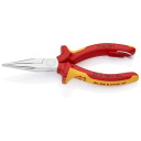 Izolēti saskaņā ar IEC 60900, izmantojami līdz 1000 V AC/1500 V DC. Snipe Nose Side Cutting Pliers (Radio Pliers) ar hromētu virsmu, rokturi izolēti ar daudzkomponentu satvērieniem, VDE pārbaudīti, ar integrētu izolētu piekļuves punktu rīka piekāršanai. Ideāli piemēroti smalkiem satvērieniem un griešanas darbiem. Pusapaļas, garas, sašaurinātas žokļi. Rievotas satveršanas virsmas. Ar griešanas malām mīkstam, vidēji cietam un cietam vadam. Griešanas malas papildus indukcijas cietinātas, griešanas malas cietība apmēram 61 HRC. Vanādija elektriskā tērauda, kalta, vairākkārtēji eļļā cietināta.