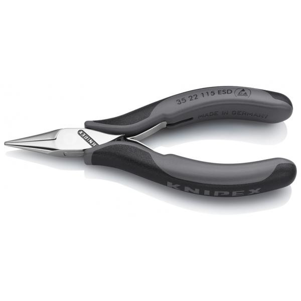 Elektronikas knaibles ESD ar spoguļa apdari, rokturi ar daudzkomponentu satvērieniem. Precīzas knaibles smalkiem montāžas darbiem, piemēram, elektronikā un precīzajā mehānikā. Paredzētas satveršanai, turēšanai un locīšanai. Elektriski izlādes rokturi - dissipatīvi. Izturīga, bez atspere, kaste. Gludi apstrādātas satveršanas virsmas. Malas rūpīgi noņemtas. Zema berzes dubultā atsperes sistēma maiga un vienmērīga atvēršanai. Spoguļa apdare kopā ar smalku eļļas plēvi nodrošina efektīvu rūsas aizsardzību - nav ķēdes kļūdu, ko izraisa hromēšanas nolobīšanās no pārklātiem instrumentiem. Ar divkrāsu dubultkomponentu rokturiem, melnā/pelēkā krāsā. Speciāls instrumentu tērauds, kalts, eļļas cietināts. Mazas, slaidas ar ESD aizsardzību: satveršanas knaibles jutīgai elektronikai. Īsas, gludas un labas: 115 mm garas, nodrošinot pietiekamu kustības brīvību pat ierobežotā telpā. Knipex 35 22 115 ESD elektronikas knaibles ir kompakts instruments, ko var izmantot arī grūti pieejamās vietās: ideāli piemērotas elektroniskajām ierīcēm, drukātajām shēmām un precīzām konstrukcijām, piemēram, mērīšanas iekārtām vai delikātiem aparātiem. Šeit parasti ir diezgan ierobežota telpa. Ar tikai 115 mm garumu un slaido, pusapaļo galvu, šīs Knipex elektronikas knaibles ir ideāls instruments jutīgu komponentu delikātai satveršanai, turēšanai un locīšanai. Satveršanas virsmas ir gludi apstrādātas, lai aizsargātu jutīgas virsmas. Gali ir noapaļoti priekšā. Gluda darbība un precizitāte, ar kastes locījuma dizainu un dubulto atsperi. Jo mazāks un jutīgāks ir komponents, jo lielākas ir prasības attiecībā uz satveršanas knaiblēm. Precīza, labi izmērīta roku spēka pārvade uz komponentu ir vitāli svarīga. Knipex 35 22 115 ESD mehānika ir izcili smalki noregulēta. Kastes locījums ir izturīgs un gludi darbojas. Iekšējais rokturis ir vadīts no abām pusēm ar ārējo rokturi. Tas nodrošina precīzu darbību bez jebkādas slīpuma efekta. Zema berzes dubultā atsperes sistēma atbalsta maigu knaibļu atvēršanu. Strauja izlāde, kas rodas no elektrostatiskām uzlādēm, ir īpaši bīstama elektronikā. Ar Knipex 35 22 115 ESD elektronikas knaiblēm elektrostatiskā enerģija tiek izlaista pastāvīgā, kontrolētā veidā caur vadītspējīgiem rokturiem. Tas novērš augstas potenciāla atšķirības starp komponentu un instrumentu. Nav straujas izlādes. Rūsas aizsardzība ir droša arī jutīgiem elektronikas komponentiem. Nav hromēšanas, tāpēc hroma gabali nevar nolobīties un nokrist uz drukātajām shēmām. Spoguļa apdare kopā ar smalku eļļas plēvi nodrošina pilnīgu korozijas aizsardzību knaiblēm darbnīcas lietošanas laikā, ja eļļas plēve tiek periodiski atjaunota. ESD aizsardzība pret nekontrolētu elektrostatisko izlādi; droša rūsas aizsardzība. Knipex 35 22 115 ESD ir vērtīgs atbalsts, barojot jutīgus komponentus. Norādītas žokļu formas, lai satvertu mazus komponentus un veiktu smalkus montāžas darbus ierobežotā telpā.