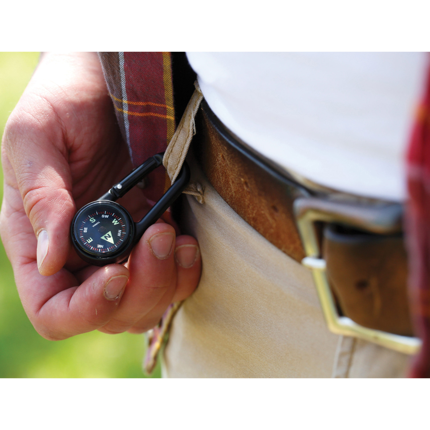 Šis šķidrumā pildītais kompass ir ērts karabīns, kas ļauj to ātri un vienkārši pievienot somai vai mugursomai. Izturīgā alumīnija konstrukcija nodrošina, ka tas sekos jums gan mežā, gan pilsētā, palīdzot atgriezties atpakaļ. Gaismas virziena atzīmes ļauj orientēties vājā apgaismojumā, bet kompaktais izmērs padara to viegli piestiprināmu pie jostas, lai tas vienmēr būtu pa rokai ātrai atsaucei.