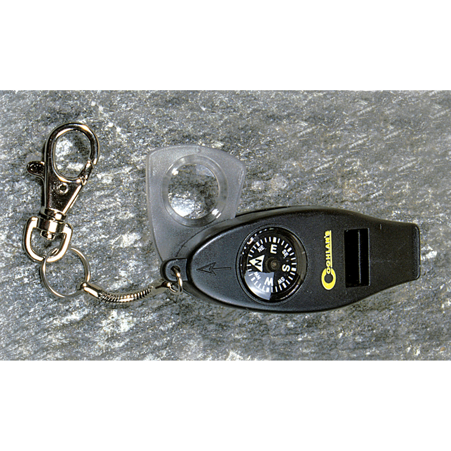 4 funkciju svilpe - kompass, termometrs, palielināmais stikls un, protams, skaidri dzirdama svilpe, viss vienā ierīcē ar karabīnes stiprinājumu.