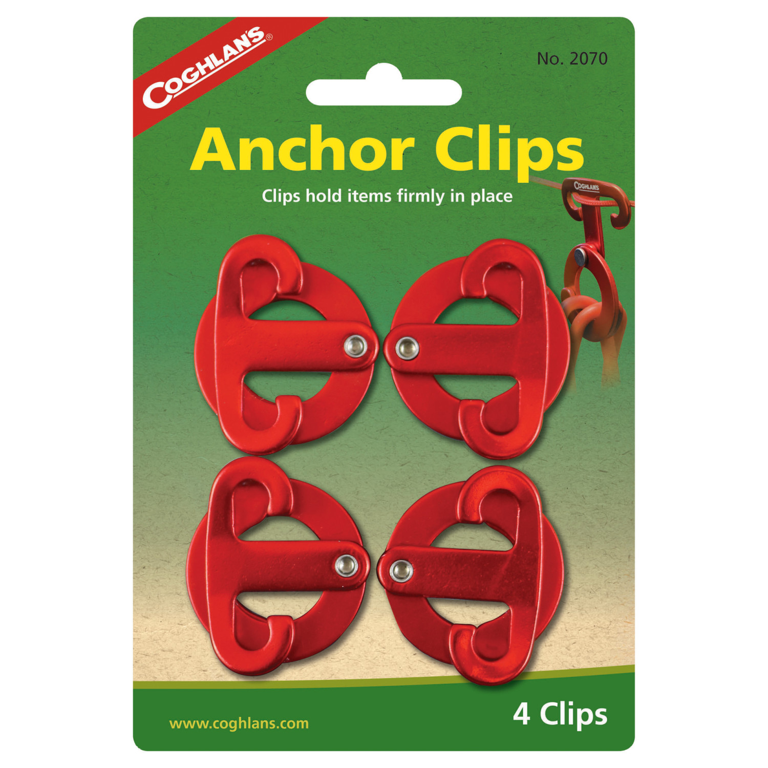 Coghlan's Anchor Clips ir jauns un vienkāršs risinājums dažādu priekšmetu piestiprināšanai pie karājošām virvēm vai auklām. Katram Coghlan's Anchor klipam ir divi pretēji šūpojoši pusmēness formas āķi, kas cieši apņem priekšmetus, izmantojot gravitāciju, lai paliktu aizvērti. Klipa augšdaļa apņem stingru auklu, izmantojot berzi, lai noturētos vietā. Ideāli piemēroti veļai, dvieļiem, lampām, ūdens pudelēm vai citiem piederumiem.