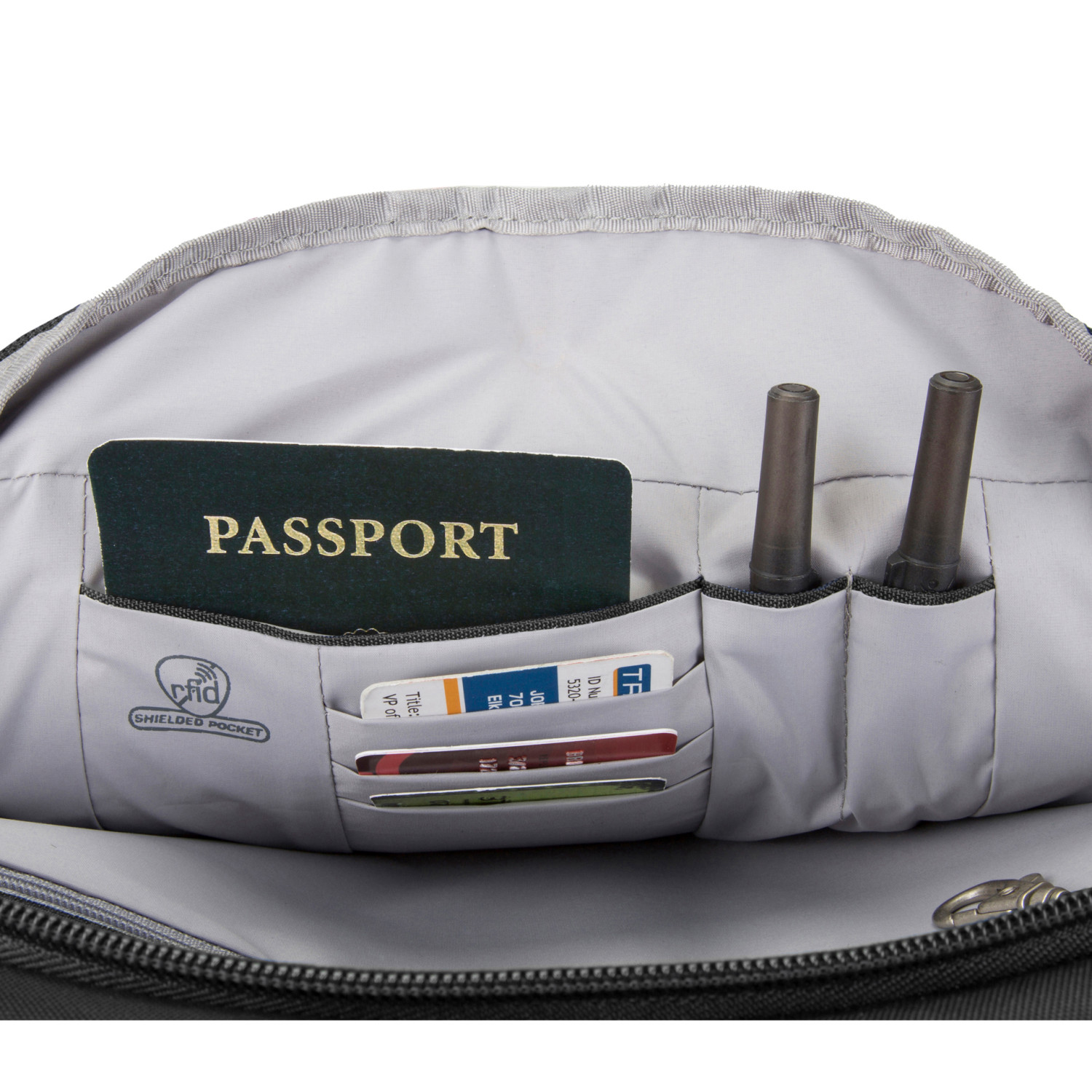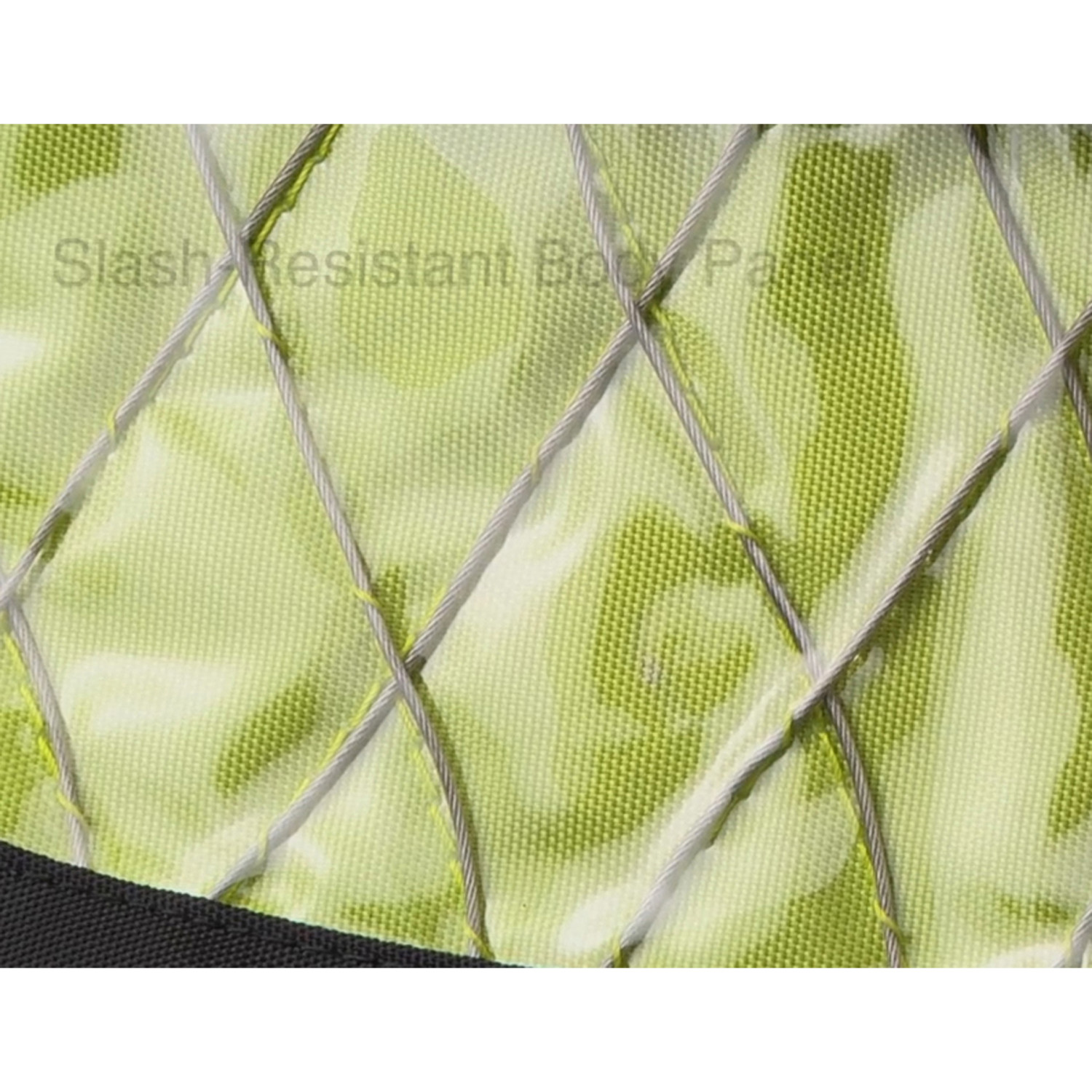 Šis pretzagšanas mugursoma ir izgatavota no nerūsējošā tērauda sieta. Tajā ir griezumiem izturīga siksna un pretzagšanas rāvējslēdzēji, kas nodrošina jūsu personīgo mantu drošību. Siksna slēpj nerūsējošā tērauda virves, lai novērstu griešanu. Mugursomā ir atslēgu turētājs ar LED lampu, rokturis un sānu kabata ūdens pudelei. Aizmugurējā kabata ir polāra, piemērota 15.6" klēpjdatora vai planšetdatora pārvadāšanai. Priekšējā kabata ir aprīkota ar RFID aizsardzību pasei un kredītkartēm.