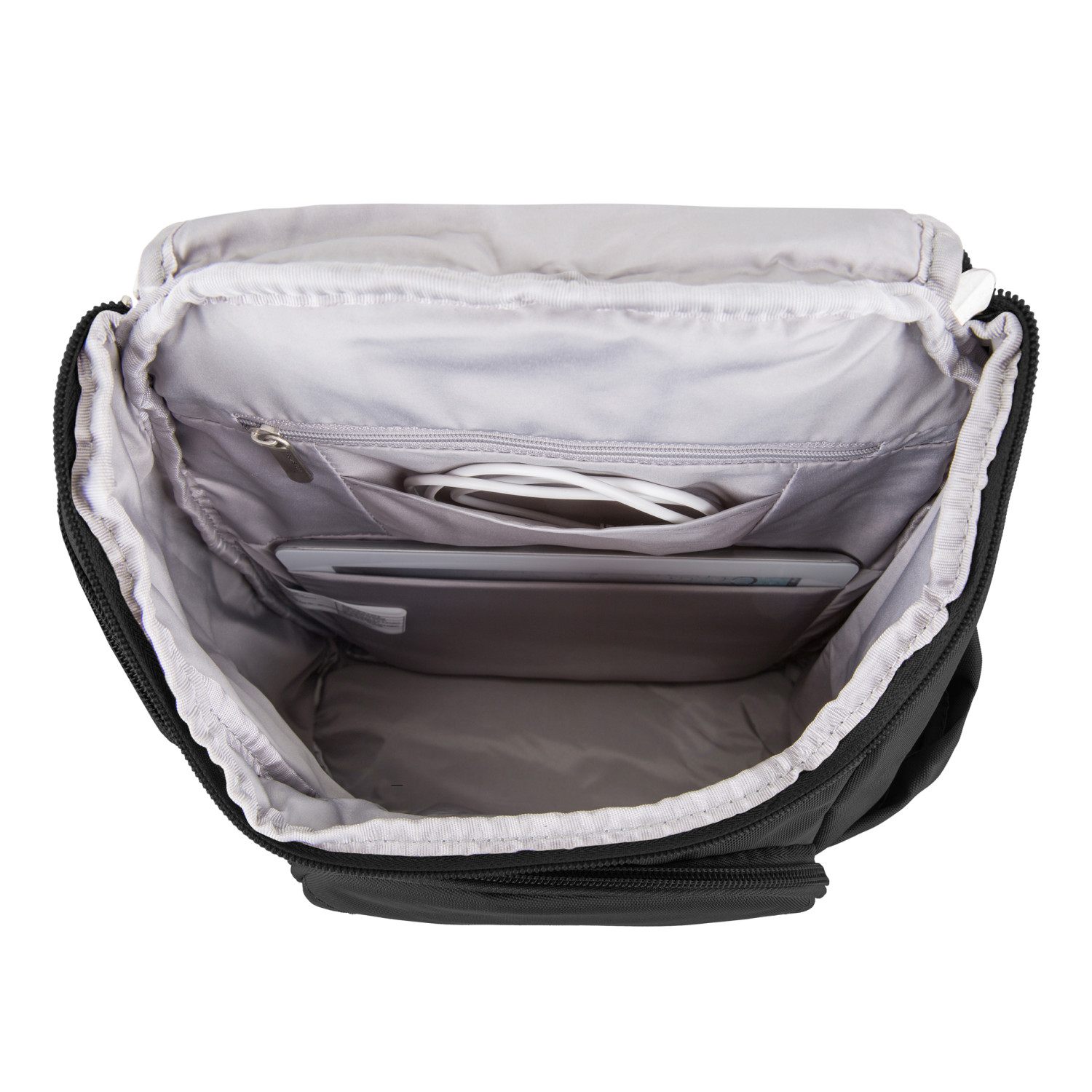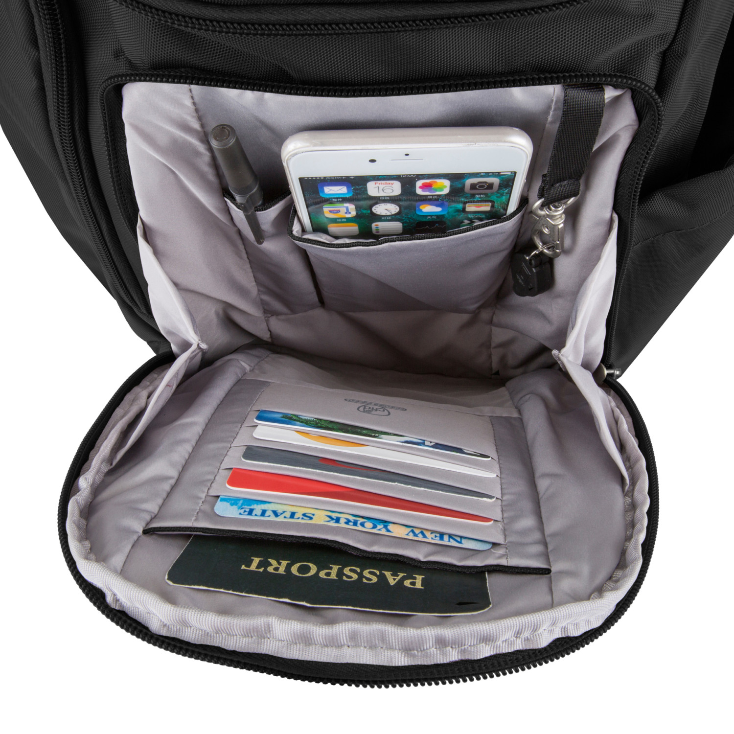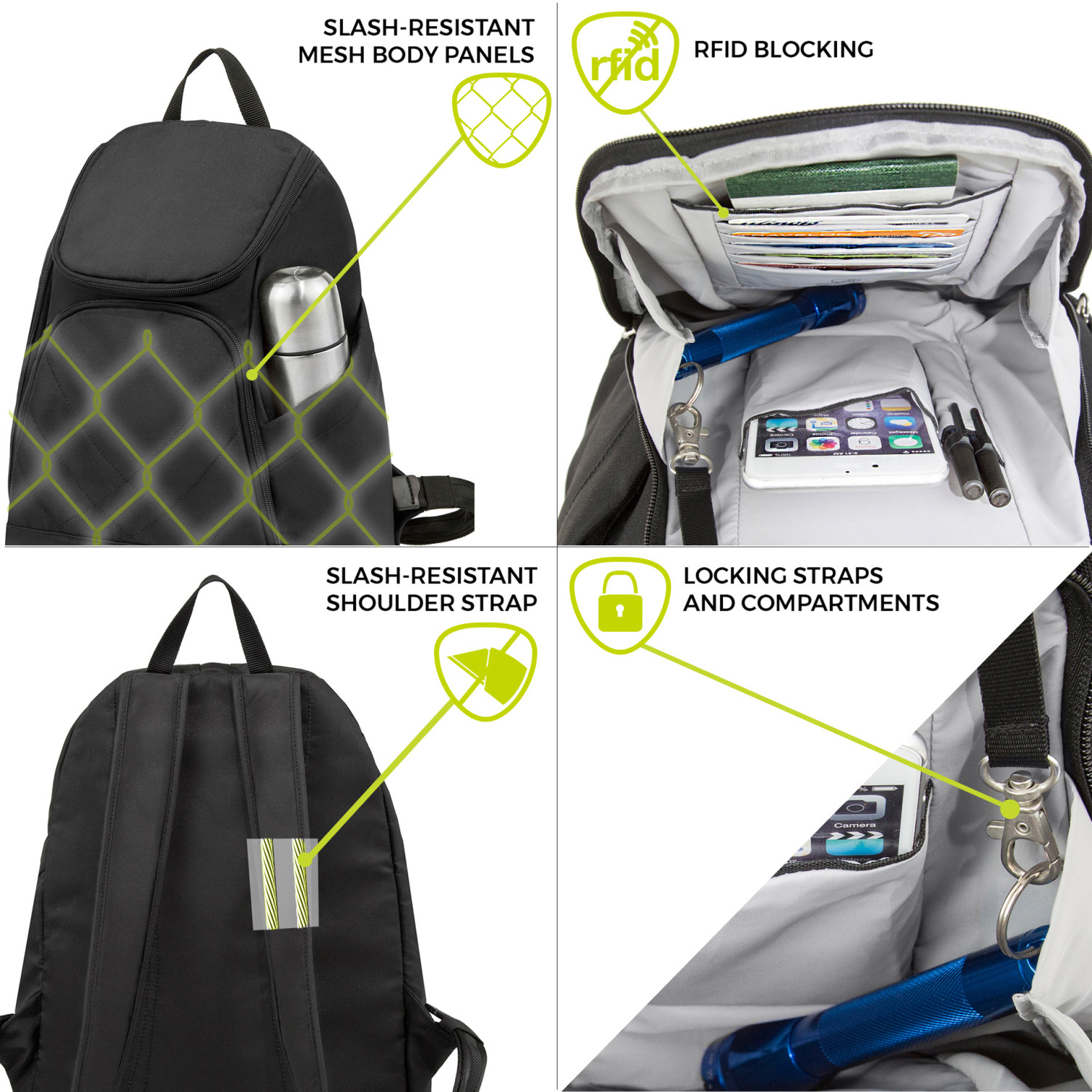 Šis pretzagšanas mugursoma ir izgatavota no nerūsējošā tērauda sieta. Tajā ir griezumiem izturīga siksna un pretzagšanas rāvējslēdzēji, kas nodrošina jūsu personīgo mantu drošību. Siksna slēpj nerūsējošā tērauda virves, lai novērstu griešanu. Mugursomai ir atslēgu turētājs ar LED lampiņu, rokturis un sānu kabata ūdens pudelei. Aizmugurējā kabata ir apvilkta ar flīsu, piemēram, 15.6" klēpjdatora vai planšetdatora pārvadāšanai. Priekšējā kabata ir aprīkota ar RFID aizsardzību pasei un kredītkartēm.