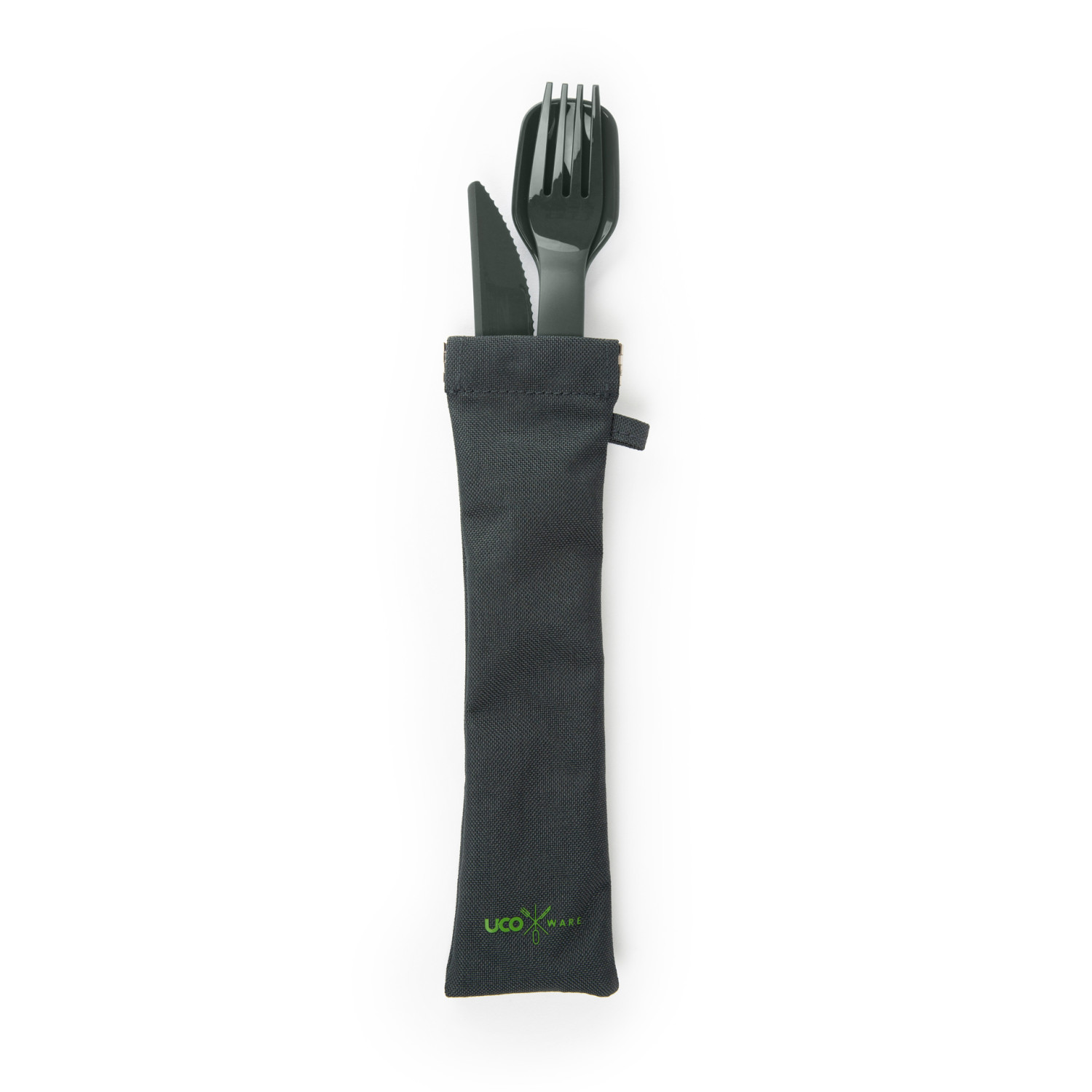 Praktisks galda piederumu komplekts (nazis, dakša, karote) elegantiem poliestera vāciņā. Ir caurums, lai pievienotu komplektu mugursomai vai somai. Komplekts ir mazgājams trauku mazgājamajā mašīnā un izgatavots no 100% pārstrādātas plastmasas.