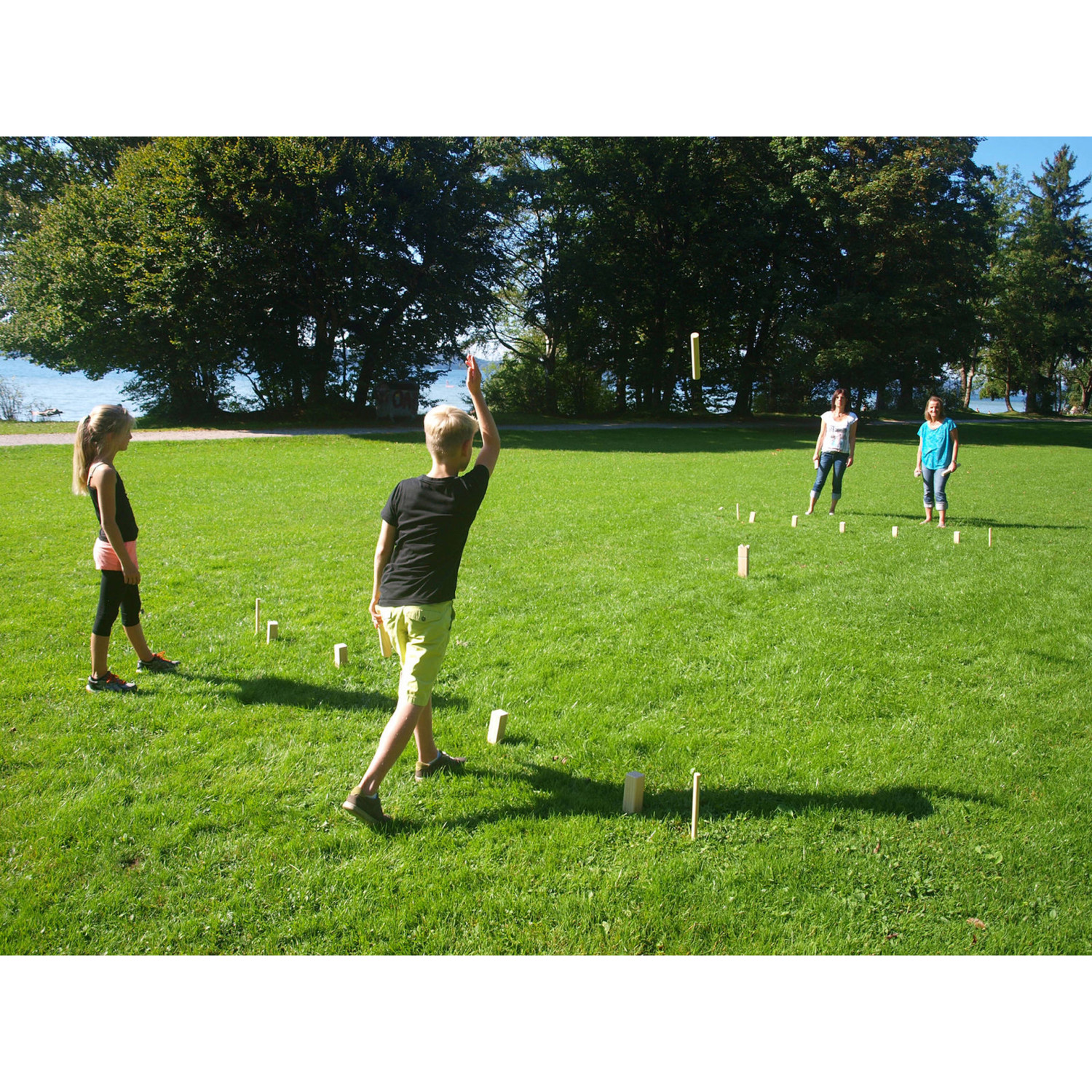 Populārā skandināvu spēle ceļojumiem un dārzam. Komplektā ir 1 karalis, 10 kubi, 6 metamie nūjas un 4 marķēšanas nūjas. Ļoti patīkama spēlēšanai. Izgatavota no FSC sertificētas priedes. Iekļautas instrukcijas.