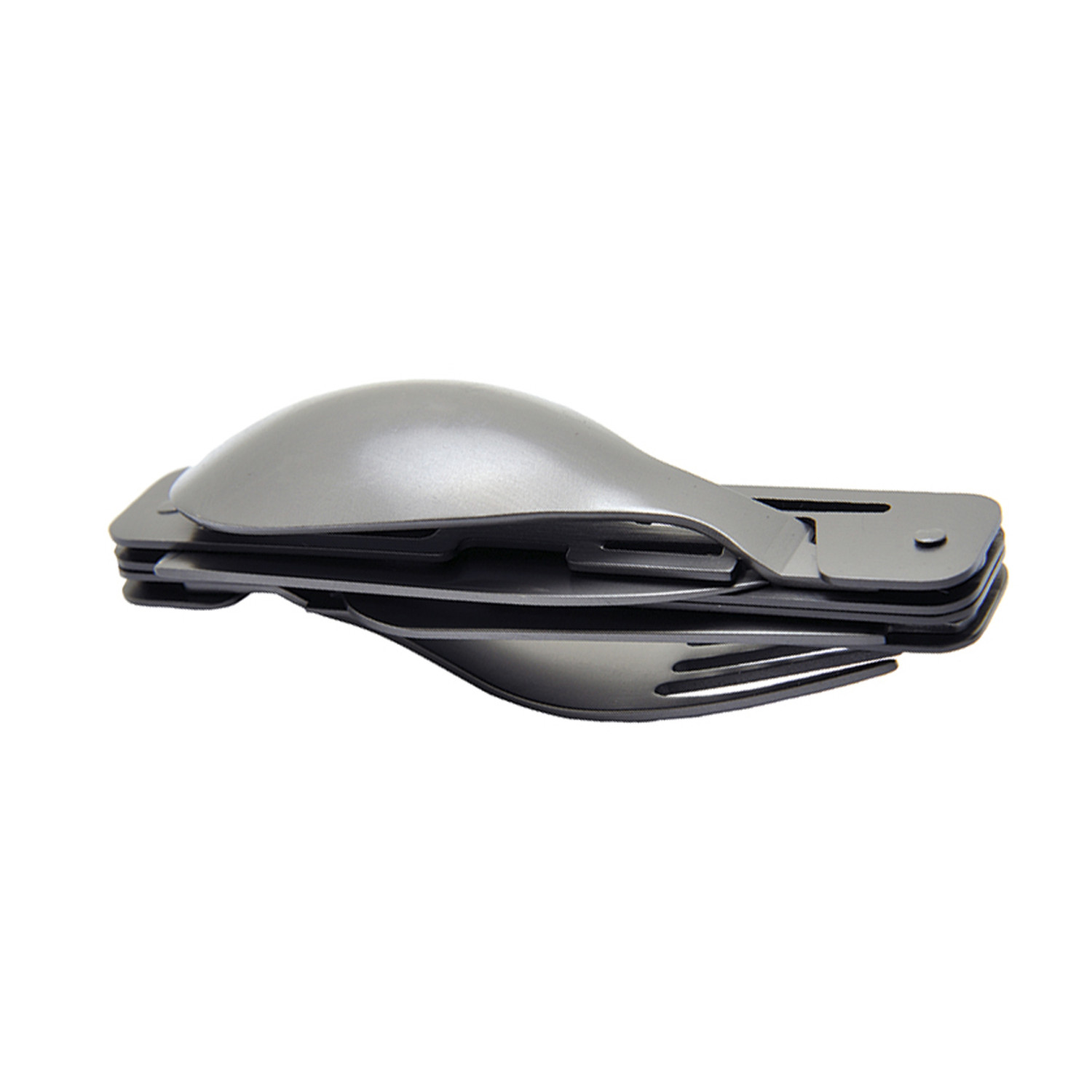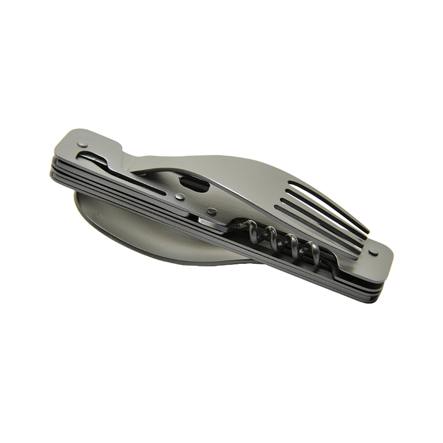 6 funkciju galda piederumu komplekts: nazis ar zobveida asmeni, karote, dakša, konservu atvērējs, pudeļu atvērējs un korķu atvērējs. Nerūsējošā tērauda piederumi ir sadalāmi, ļaujot tos izmantot individuāli kā dakšu, nazi vai karoti. Komplektā iekļauta neoprēna soma.