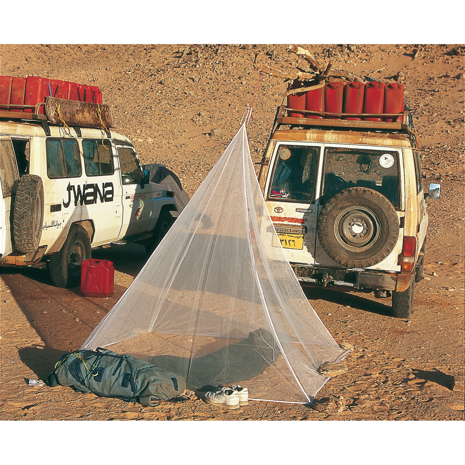 Telts formas moskītu tīkls, izgatavots no augstākās kvalitātes un īpaši viegla poliamīda. Novietojams uz gultas. Ļoti kompakts izmērs. Piestiprināšana ar cilpām piramīdas augšpusē un apakšējos stūros, kas palīdz noslēgt tīklu ap matraci.